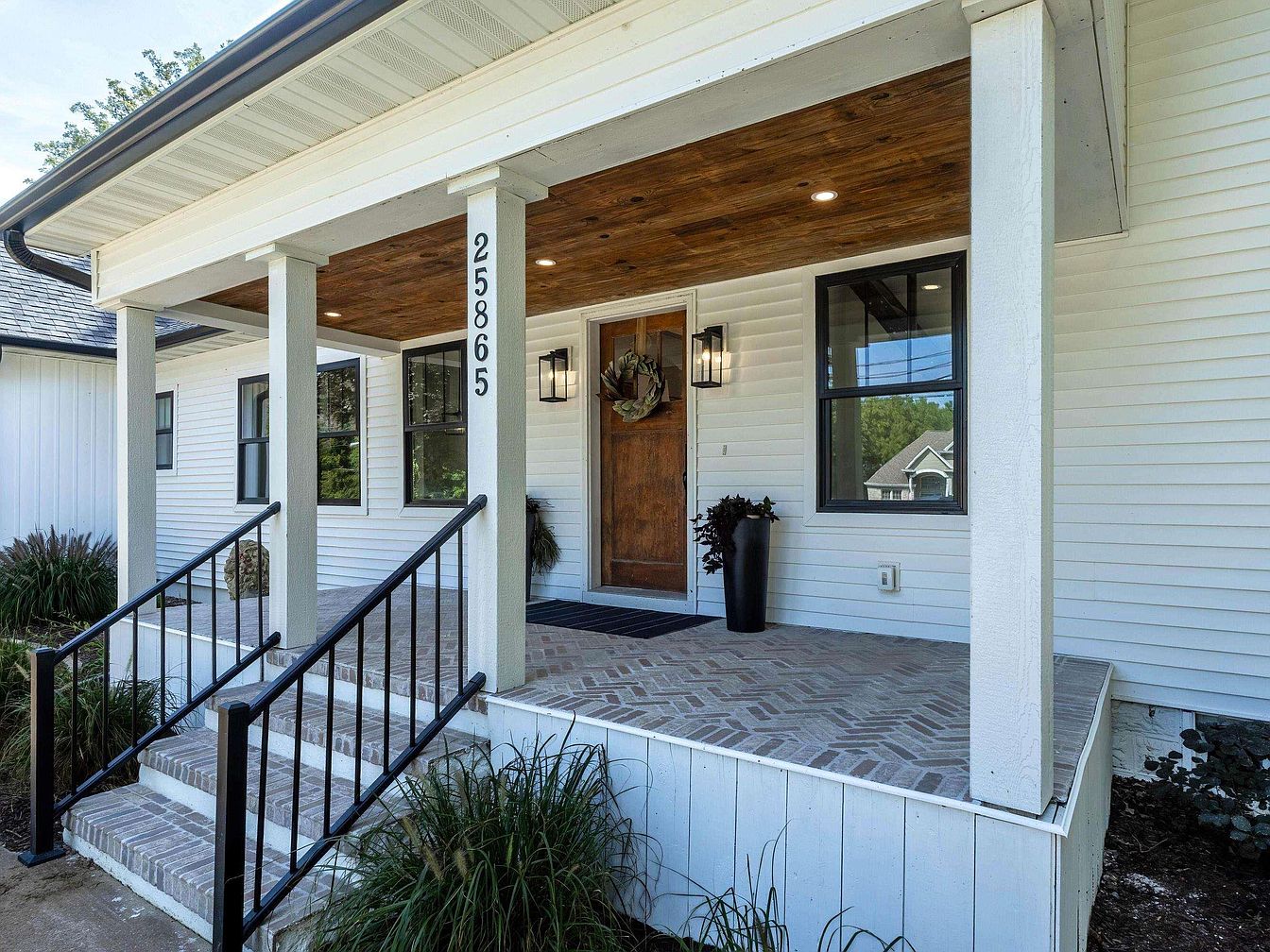 A welcoming front porch showcases a classic and clean aesthetic, highlighted by crisp white siding and a warm wooden ceiling with recessed lights. Three square columns support the roof and frame a natural wood door adorned with a seasonal wreath and flanked by black modern lantern-style sconces. A black metal railing lines both sides of the wide steps made of brick, matching the herringbone-patterned brick porch floor. Rectangular windows with black trim add contrast to the exterior. The porch is neatly landscaped with ornamental grasses and a tall black planter, enhancing the inviting and timeless curb appeal.