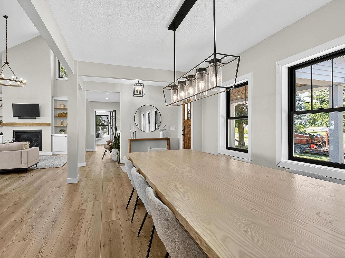 A modern open-concept dining space featuring a long light-wood table with minimalist gray upholstered chairs positioned along each side. Natural light streams in through two large black-trimmed windows, highlighting the clean-lined architecture. The color palette is primarily soft neutrals with white walls, pale wood floors, and accents of black metal seen in the oversized linear chandelier above the table. Adjacent, the room flows seamlessly to a living area with a fireplace, built-in shelves, and a mounted TV. A round mirror, a console table, and a few simple decorative pieces add subtle sophistication near the entryway.