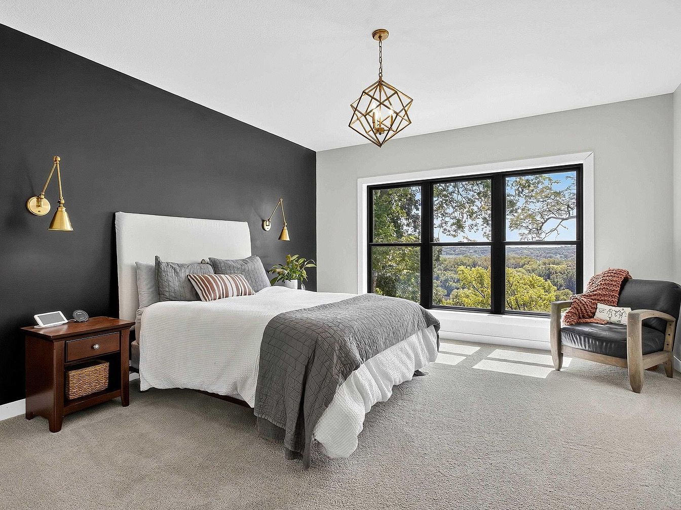 A serene bedroom with a modern, minimalist style features a charcoal accent wall behind a white upholstered headboard bed, dressed in crisp white and dark gray bedding with coordinating throw pillows. Gold wall-mounted reading lights frame either side of the bed, complemented by a geometric gold pendant overhead. To the left is a wooden nightstand with a wicker basket and digital display, while to the right, a contemporary armchair with a soft black seat, wooden arms, and a rust-toned throw sits near an expansive window that overlooks treetops and a distant valley, flooding the room with natural light.