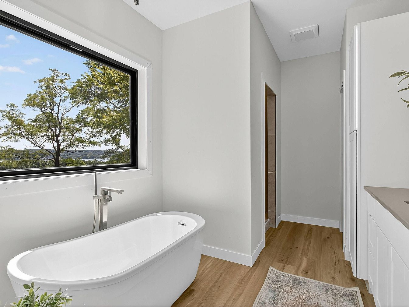 A serene bathroom features a deep white freestanding soaking tub positioned directly beneath a large, black-framed picture window. The window provides an expansive view of leafy green trees and distant water, bringing a sense of tranquility to the space. Pale gray walls and a warm, light-toned wood floor create a clean, airy atmosphere. Modern touches include a sleek, angular chrome tub faucet and minimalist white cabinetry along one wall. A muted area rug adds softness near the sink. Greenery placed on the counter enhances the natural feel, and the space is uncluttered, emphasizing simplicity and relaxation.