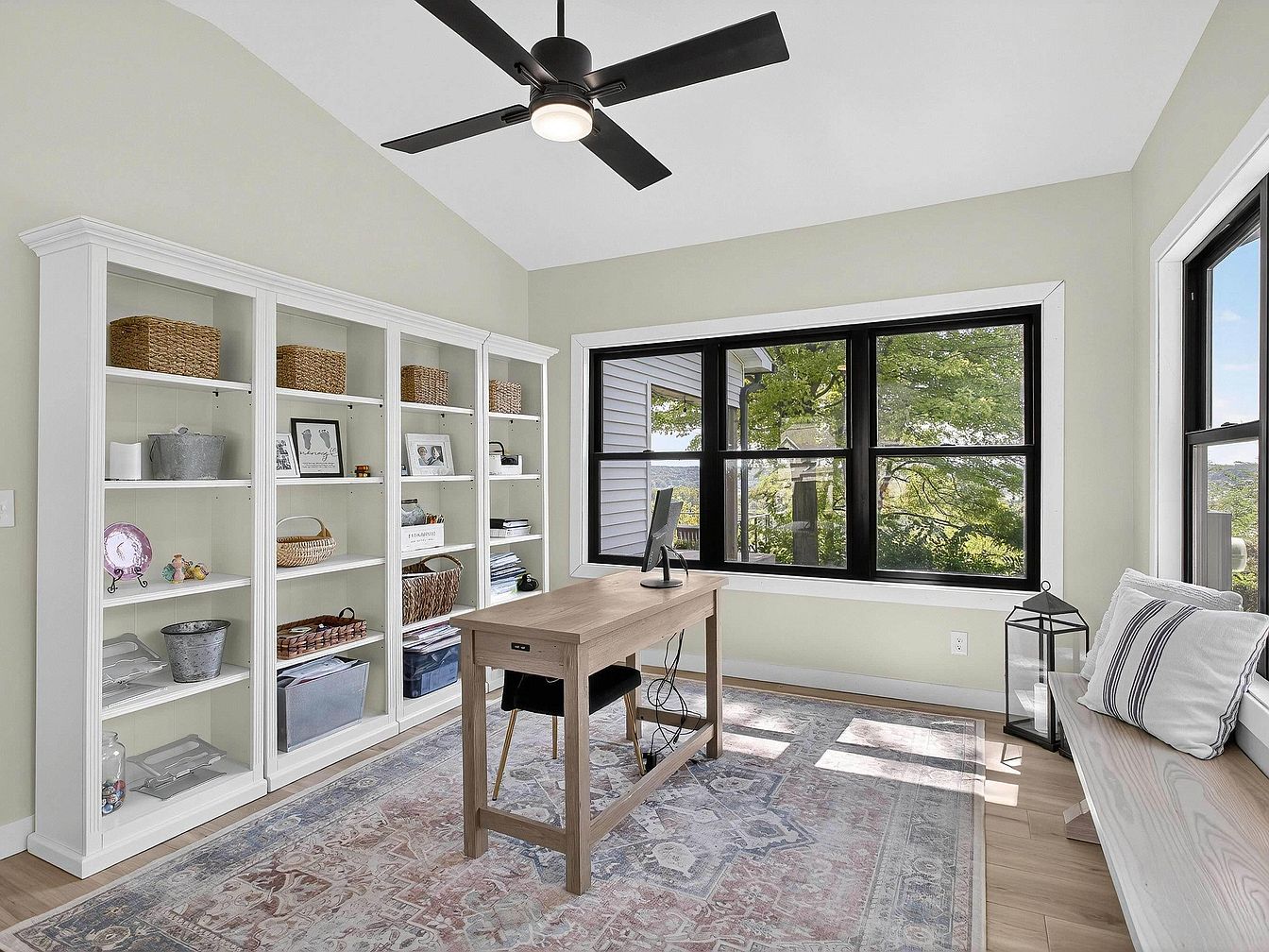 A bright, airy workspace featuring a light wood desk at the center, paired with a simple black office chair on a pastel-patterned area rug. Along one wall stands a series of three white built-in bookshelves, each neatly arranged with baskets, framed photos, books, and decorative items. Opposite the bookshelves, large black-framed windows let in abundant natural light and provide a view of leafy trees outside. Beneath the window, a light wooden bench topped with striped cushions and a lantern adds a touch of comfort. The room has pale green walls and is topped by a modern black ceiling fan.