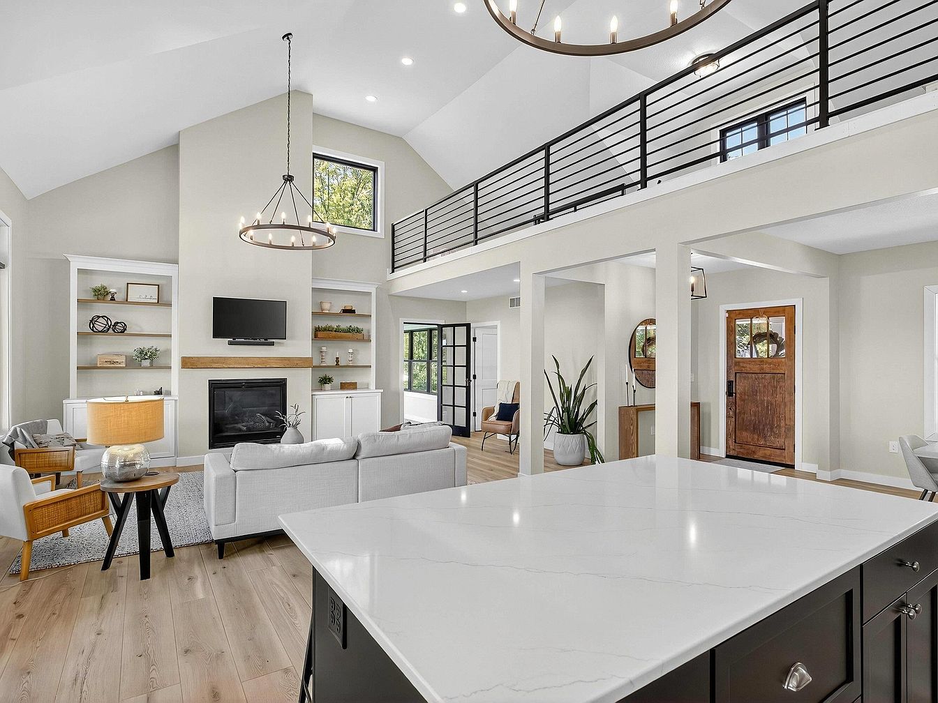 A spacious, airy room combines a modern living area with sightlines to the entryway. High vaulted ceilings and a dramatic black metal staircase railing accentuate the open concept. A stone-colored fireplace with a wooden mantel serves as a focal point, flanked by built-in shelving filled with simple decor, books, and greenery. Light hardwood floors add warmth, complemented by soft gray walls. A sleek kitchen island with white quartz surface is in the foreground, facing a cozy seating area with a white sofa, light wood chairs, and a neutral area rug. Large windows and glass doors invite in abundant natural light.