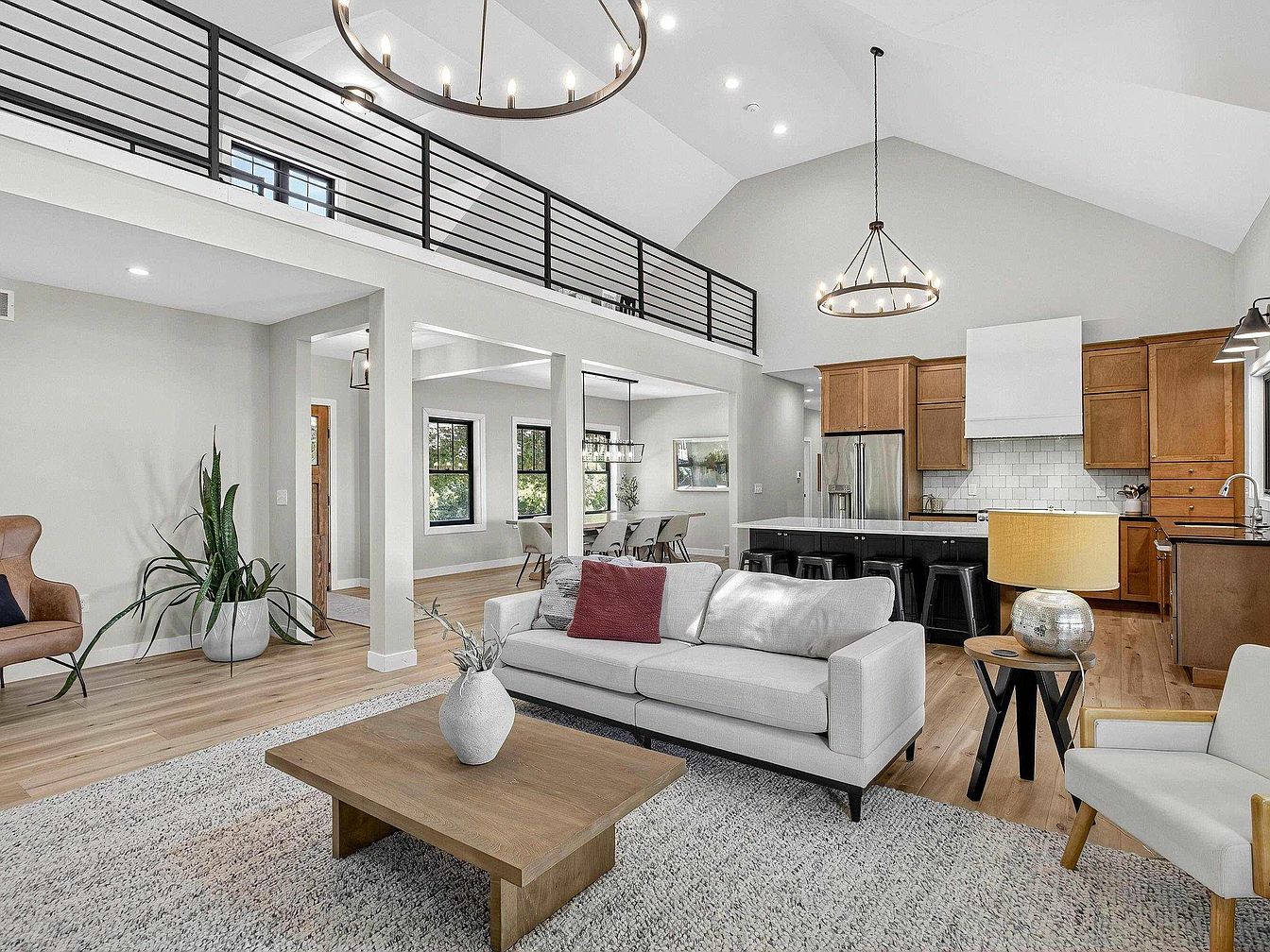 A spacious, airy living area with living room and kitchen sharing an open floor plan under a vaulted ceiling. The walls are painted in a soft, neutral gray, complemented by light wood floors throughout. Central to the space is a light gray sofa with a bold, burgundy accent pillow, flanked by a contemporary coffee table and a modern side table with metallic lamp. The kitchen features wood cabinetry, a white tile backsplash, stainless appliances, and a large island with black barstools. Oversized black-trimmed windows incorporate ample natural light, while sleek iron railings accentuate the loft above, enhancing the modern, inviting vibe.