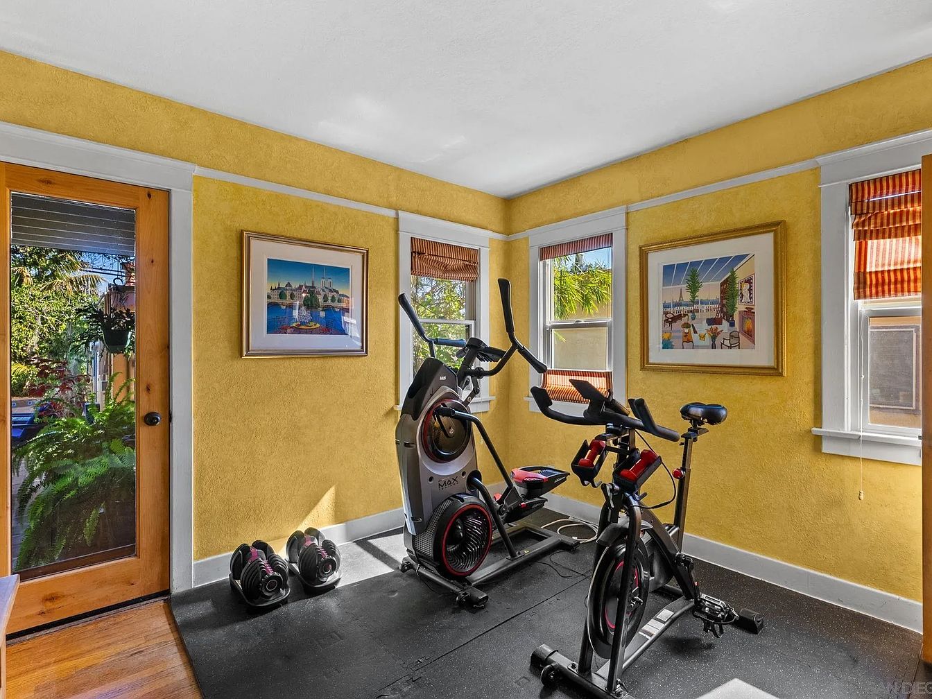 A bright home gym features walls bathed in a warm yellow hue, creating an inviting atmosphere. Natural light streams through multiple windows adorned with striped shades, illuminating the space. A compact elliptical machine and a stationary bike stand against the wall, contributing to the fitness motif. The textured, rubber flooring absorbs sound, enhancing comfort during workouts. Framed artwork, depicting serene scenes, adds a splash of color and personality. A wooden door with glass panels leads to the outside, inviting a touch of nature in, while a pair of dumbbells rest neatly on the floor, completing the functional aesthetic.