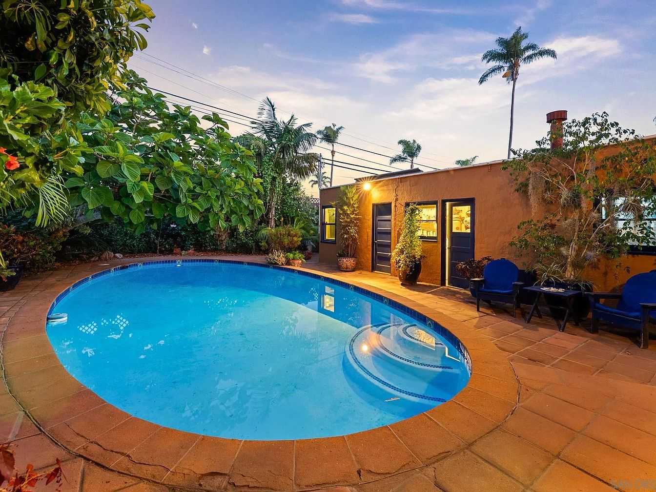 A tranquil backyard scene featuring a curved swimming pool accented by tropical plants. The pool’s bright blue water contrasts beautifully against the warm terracotta tiles that surround it. Lush greenery, including tall palm trees and dense shrubs, provides privacy and natural beauty, setting a serene atmosphere. In the background, a rustic house with warm-colored walls showcases multiple windows that emit a soft glow, suggesting an inviting interior. The dim blue twilight sky serves as a backdrop, creating a peaceful ambiance for evening relaxation or gatherings. Overall, this space embodies a tropical retreat ideal for leisure.