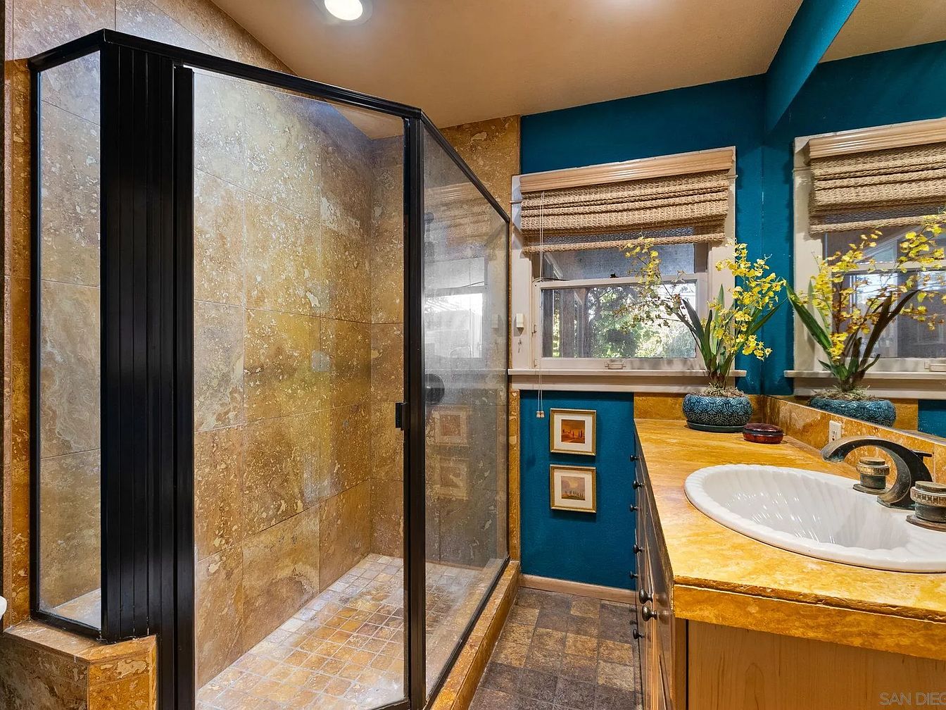 A vibrant bathroom featuring a sleek glass shower enclosure, accentuated by rich, natural stone walls that exhibit warm shades of brown and beige. The shower area is distinct, with textured tiles and a spacious atmosphere. The color scheme includes deep teal walls that contrast beautifully with the light, golden countertop and cabinetry. Natural light streams through the window, highlighting elegant bamboo shades and lush greenery in decorative pots. Below the sink, dark cabinetry complements the overall palette, while small framed art adds a personal touch. This design combines functionality with a serene and inviting aesthetic.