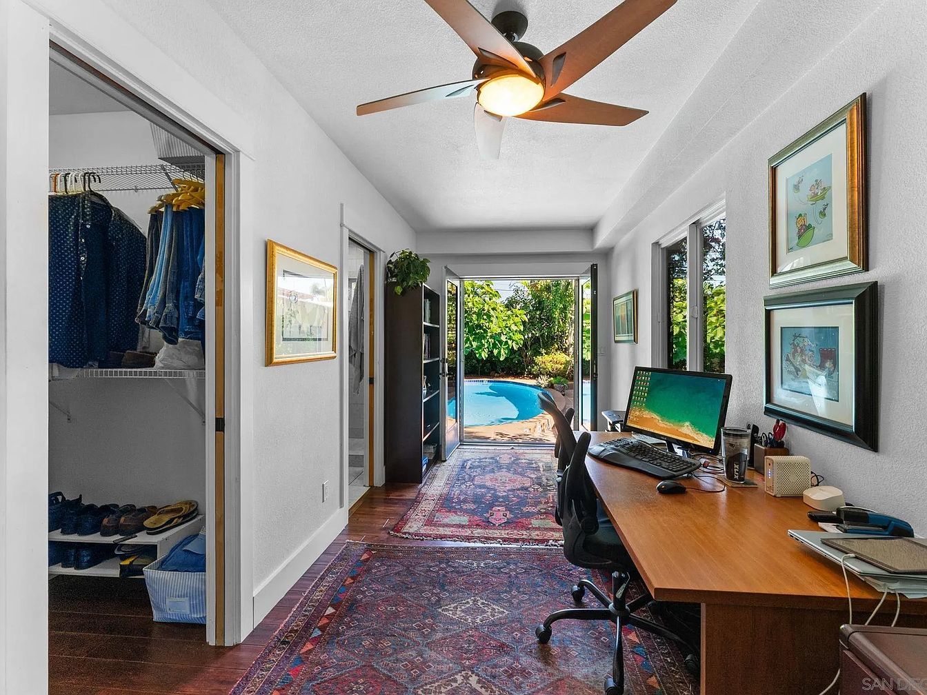 This home office features a functional layout with access to natural light through large windows. A sleek wooden desk occupies one side, equipped with a computer and office supplies. A comfortable black chair complements the workspace. To the left, a spacious closet is neatly organized with clothes on hangers and shoes displayed. The rich wooden flooring adds warmth, while a vibrant area rug introduces color and pattern. Framed artwork adorns the walls, enhancing the aesthetic appeal. A view of the pool and greenery outside invites a refreshing atmosphere, seamlessly connecting indoor and outdoor spaces.