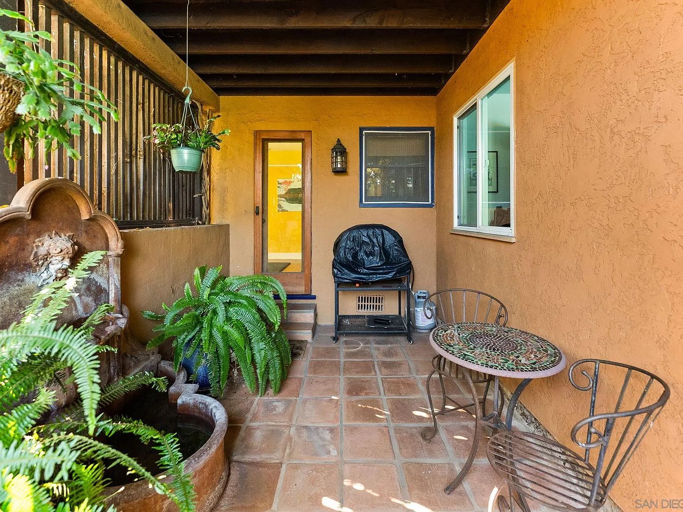 This outdoor patio features a warm, earthy color palette with terracotta tiles underfoot and a textured, ochre wall. A charming fountain, adorned with greenery, adds a tranquil ambiance, while lush ferns create a natural border, softening the space. A small, round table with a mosaic top invites relaxation, accompanied by a wrought-iron chair that enhances the rustic appeal. To the side, a covered area protects a barbecue grill, making it functional for outdoor cooking. Natural light floods in through a large nearby window, connecting the patio to the interior, creating an inviting and cozy atmosphere.