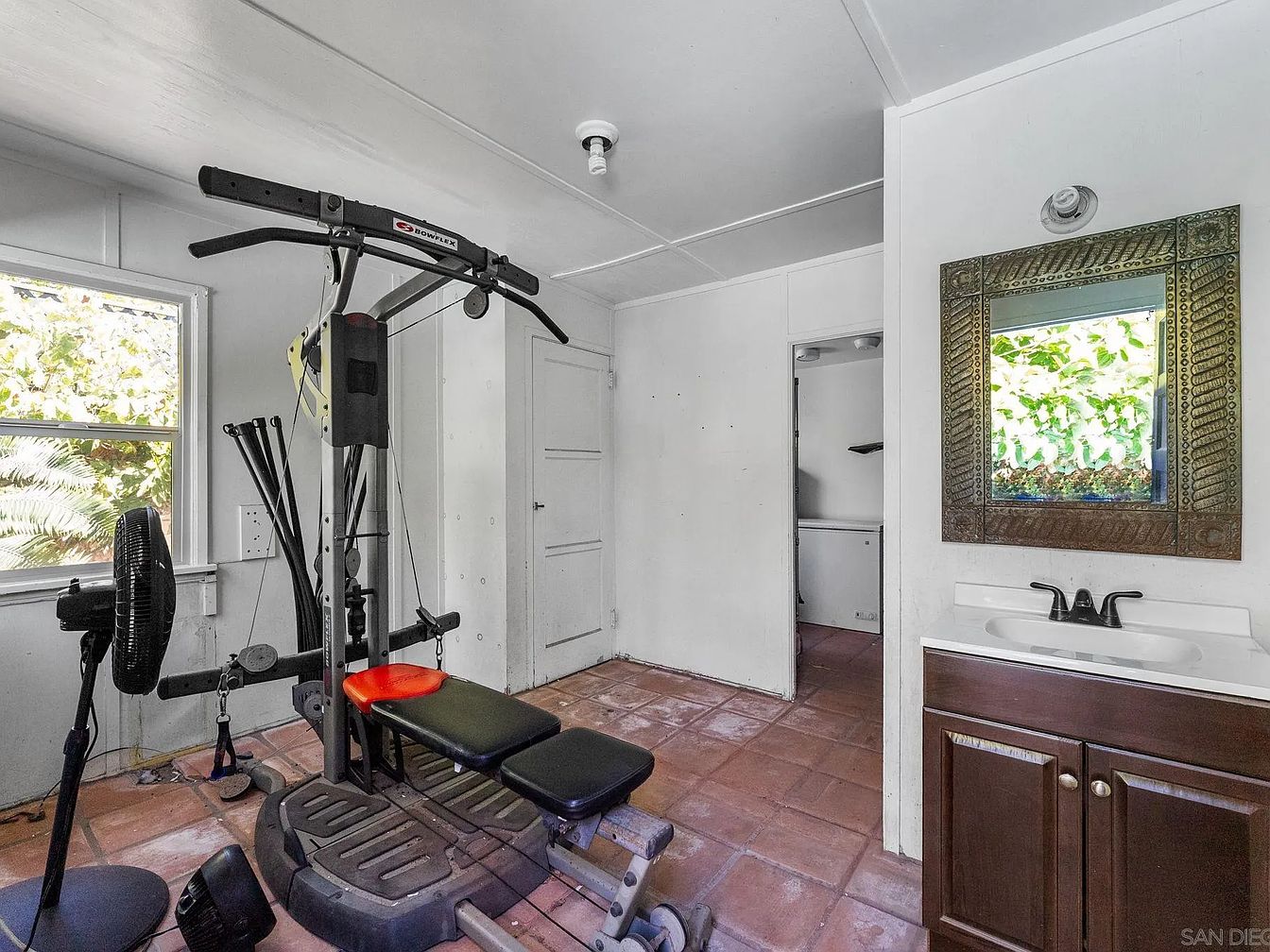 This home gym features an organized layout incorporating a multi-use exercise machine positioned centrally, flanked by a fan for ventilation. Natural light filters through a window, illuminating the space with a warm glow. The walls are painted in clean white, enhancing the open feel. Floor tiles are terracotta, offering a rustic contrast to the modern fitness equipment. A decorative mirror with an intricate frame reflects the greenery outside, adding a touch of elegance. A simple sink with dark cabinetry nearby provides functionality while maintaining the minimalist aesthetic of the room, ensuring ease of use and a pleasing environment.