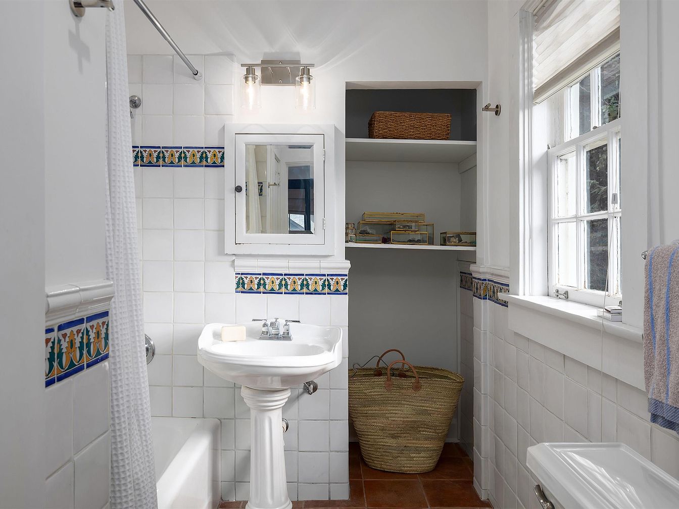 A compact bathroom features white tile walls accentuated with a decorative band of colorful Spanish-style tiles running horizontally. The pedestal sink rests beneath a mirrored medicine cabinet, which is illuminated by a pair of industrial-style glass light fixtures. Open built-in shelves next to the sink hold a woven basket and decorative glass boxes, contributing a touch of rustic charm. Terracotta floor tiles add warmth to the otherwise cool palette. A large window on the right allows ample natural light, while a shower curtain partially encloses the tub area. Blue and white towels hang neatly, contributing to a clean and inviting atmosphere.