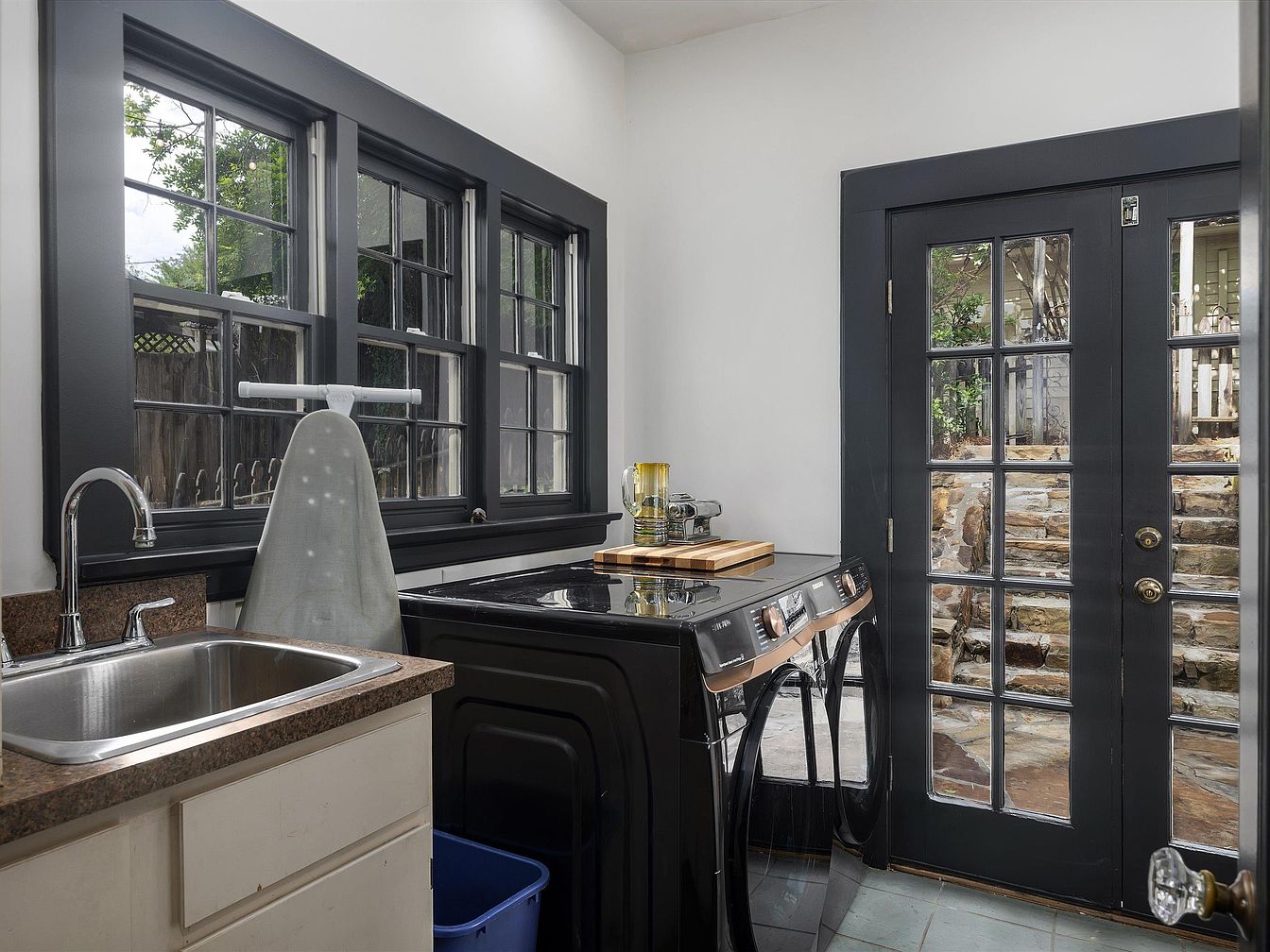 This compact laundry area features contemporary design with practical elements. To the left, a stainless steel utility sink sits in a brown speckled countertop with off-white cabinetry below. Adjacent to the sink, a modern black washer and dryer are topped with a small wooden cutting board and glassware, adding a touch of utility and charm. Large multi-pane windows framed in charcoal gray allow abundant natural light and offer views of the fenced backyard, while a matching glass-paneled door leads up to a stone terrace outside. The overall color palette combines crisp white walls, deep charcoal trim, and neutral cabinetry for a clean, classic look.