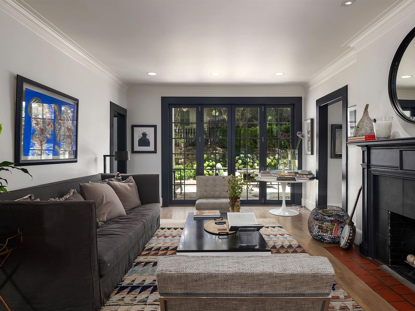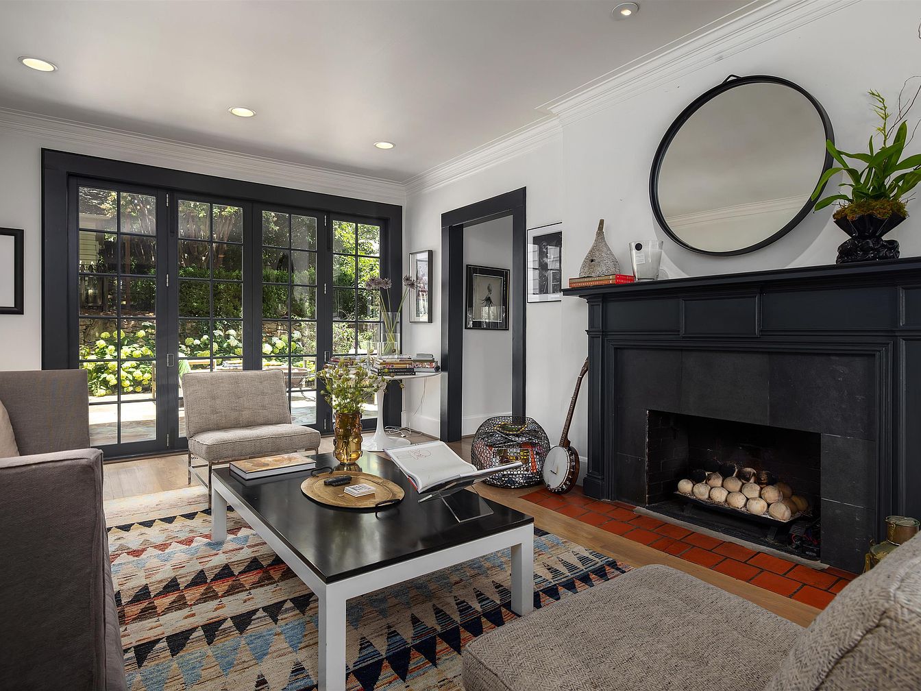 A spacious living room showcases a blend of modern and traditional aesthetics through its clean lines and historic touches. The walls are painted a gentle white, contrasted by bold black window and door frames. Large glass French doors lead to a lush garden outside, allowing ample natural light into the room. A dark, tufted sofa with plush beige pillows anchors the seating area, complemented by a geometric patterned rug and a simple, textured bench. The black fireplace is crowned with a large round mirror and curated decor. Artworks add personality and color to the walls, while eclectic accessories bring warmth and interest to the space.