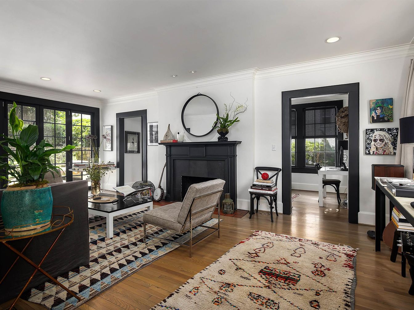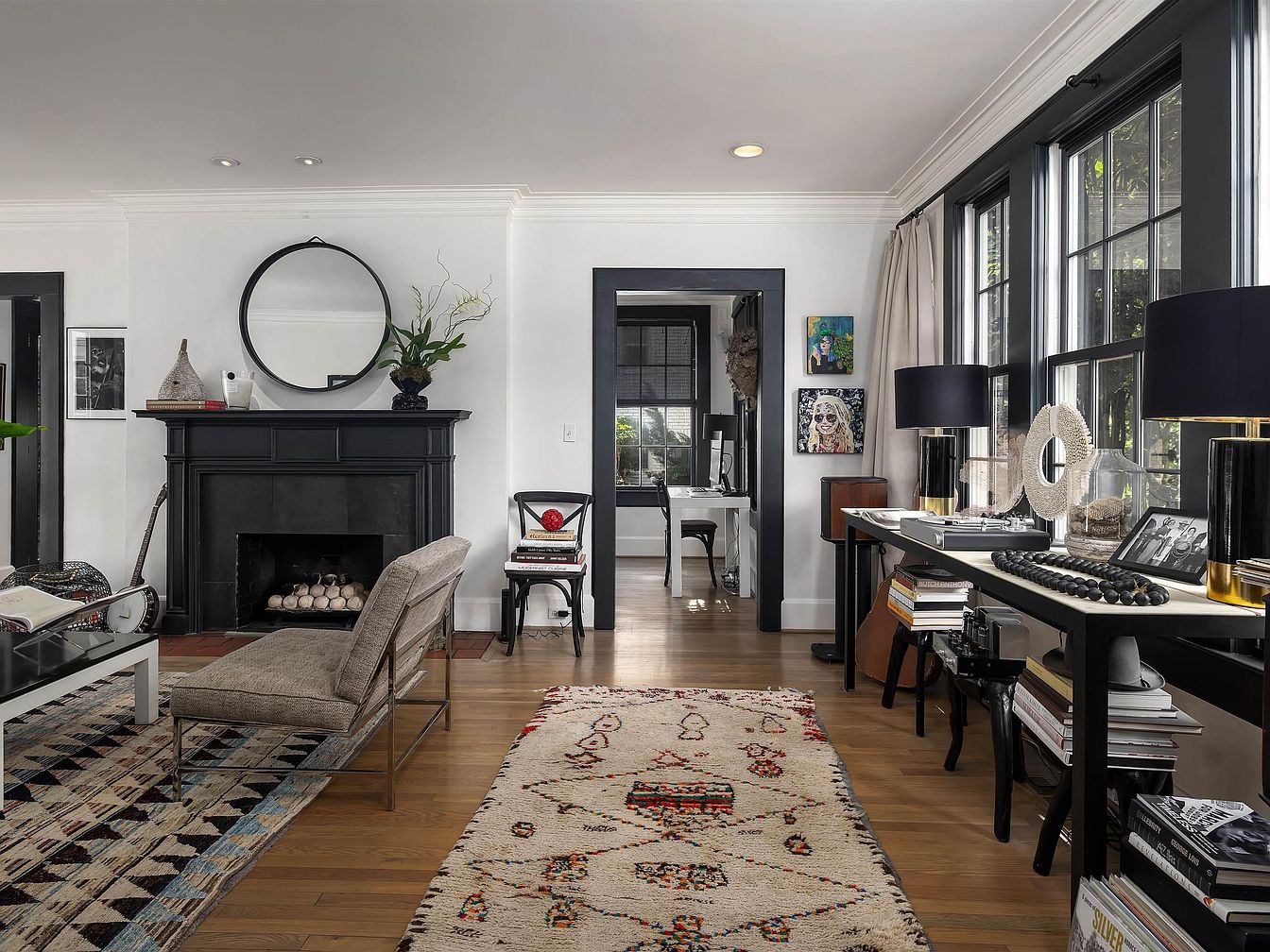 A stylish living room with a blend of modern and vintage decor features a black fireplace topped with a circular mirror and decorative objects. The room has cream-colored walls with rich black trim around windows, doors, and baseboards, providing bold contrast. Large multi-pane windows let in ample natural light, covered partly by neutral drapes. Comfortable seating includes a metal-framed chair with textured upholstery and streamlined furniture. Two complementary rugs with geometric and abstract patterns rest on polished hardwood floors. The space is accessorized with books, art pieces, lamps with black and gold bases, family photographs, and vases, creating a curated, eclectic atmosphere.