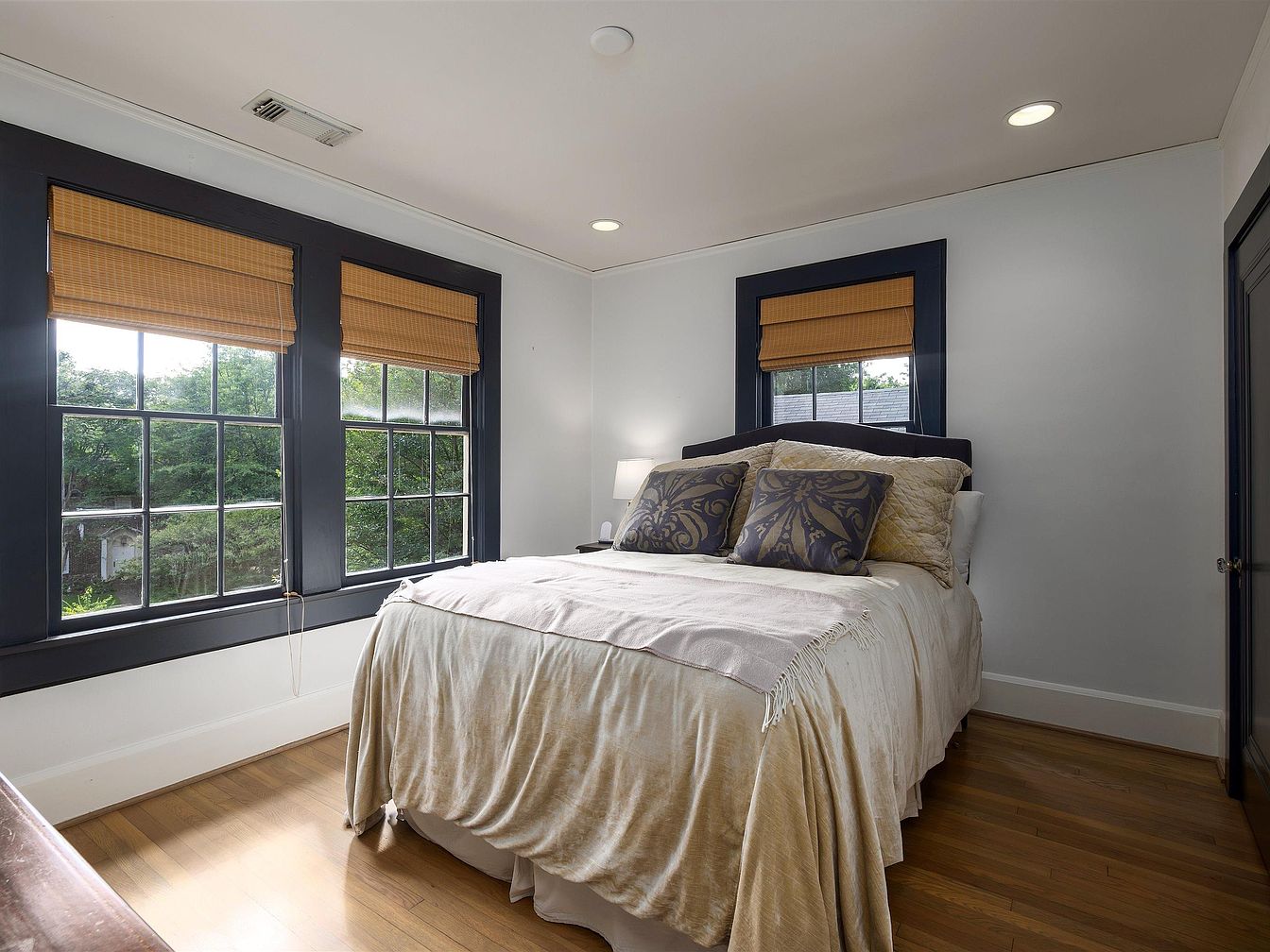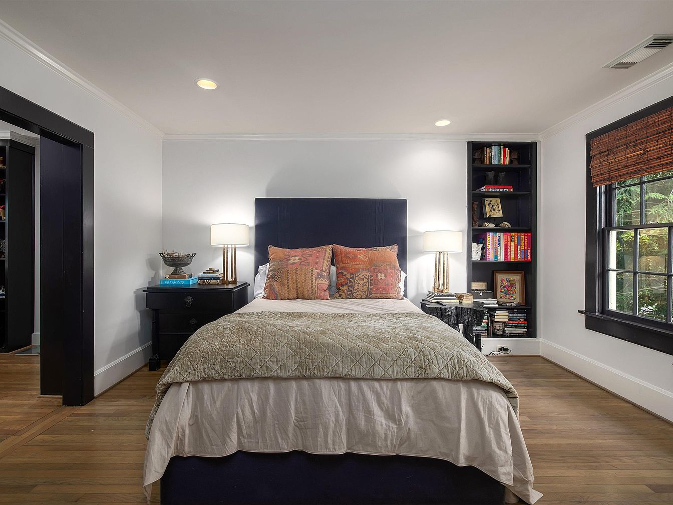 A cozy bedroom featuring a large bed with cream-colored bedding and ornate pillows in deep blue and gold patterns. Natural light streams through three tall, multi-pane windows, each framed in dark navy blue trim, topped with woven bamboo blinds. The walls are painted a soft, cool white, contrasting the warmth of the honey-toned hardwood floor. A single table lamp on a bedside table gently illuminates the space, while recessed ceiling lights add subtle brightness. The overall design blends simplicity and elegance, with an emphasis on comfort, natural light, and refined historic charm. Architectural details focus on bold trim and natural textures.
