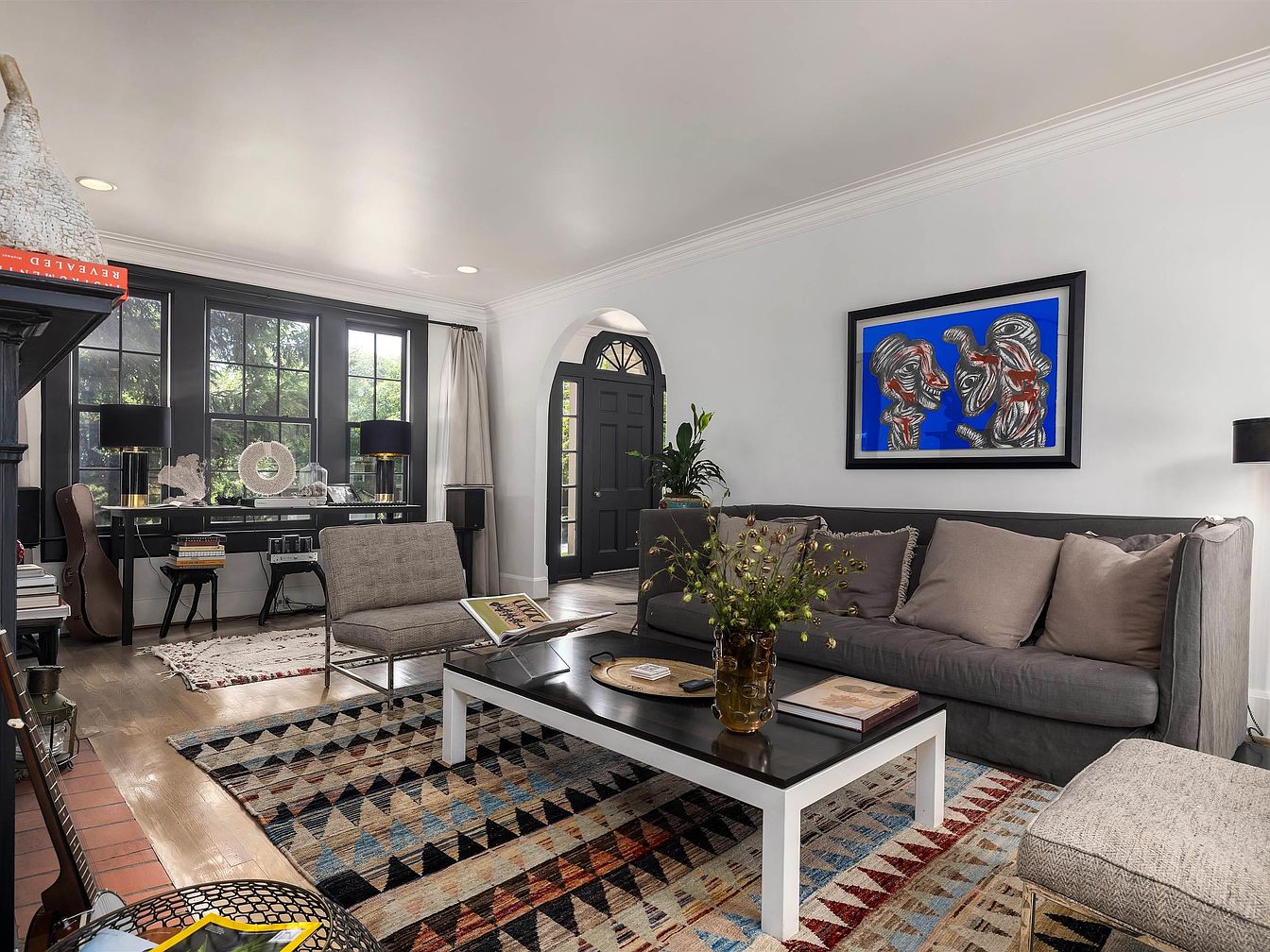 Spacious living room blending modern and eclectic elements, featuring a large gray sectional sofa with taupe pillows, two minimalist armchairs, and a low rectangular coffee table set atop a geometric-patterned area rug. The walls are a soft neutral white, accented by crown molding and a striking blue contemporary artwork above the sofa. Black-framed windows invite ample natural light, while black and brass table lamps add sophistication. A slim console table along the far window holds decorative objects and stacks of books. Light wood floors add warmth, and potted greenery alongside artsy decor create an inviting, personalized atmosphere.