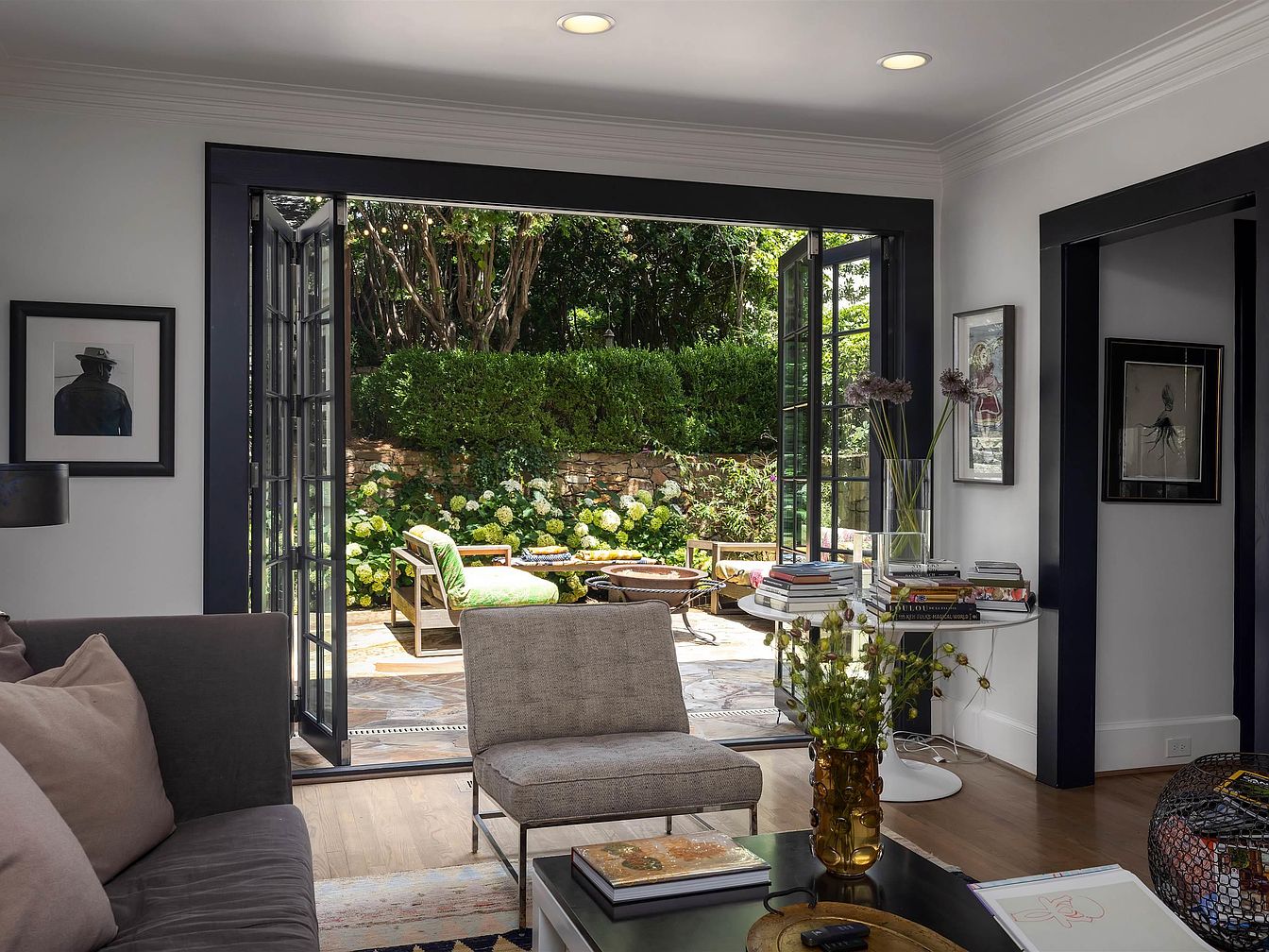 A sunlit living room features floor-to-ceiling black-paned glass doors opening to a garden, allowing natural light to brighten the space. A matte black fireplace with a round mirror above it creates a striking focal point, complimented by black trim on the doors and fireplace. Light beige chairs and a matching sofa provide comfortable seating around a black and white coffee table, which is accented with books and a brass vase of flowers. The multicolored geometric rug adds warmth and color to the neutral palette. Houseplants, artwork, and eclectic decor add personal touches and bring vibrancy to the modern classic setting.