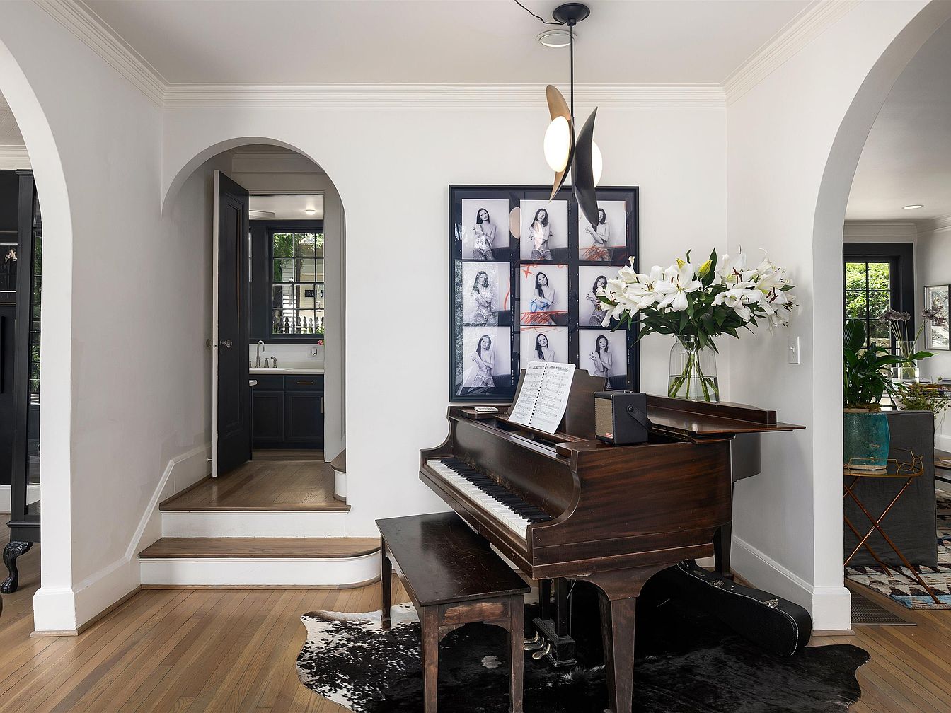 A warmly lit corner of the house features a dark wood piano with matching bench, placed over a black and white animal hide rug. A glass vase of fresh white lilies sits atop the piano, adding elegance and freshness to the space. Behind the piano, a set of black-and-white photographic portraits is arranged in a symmetrical grid, giving a personal and artistic touch to the wall. The room is framed by soft white walls, crown molding, and graceful arched doorways leading to adjacent rooms. A few steps lead up to a small alcove with a dark vanity and window, maintaining the classic yet modern aesthetic.
