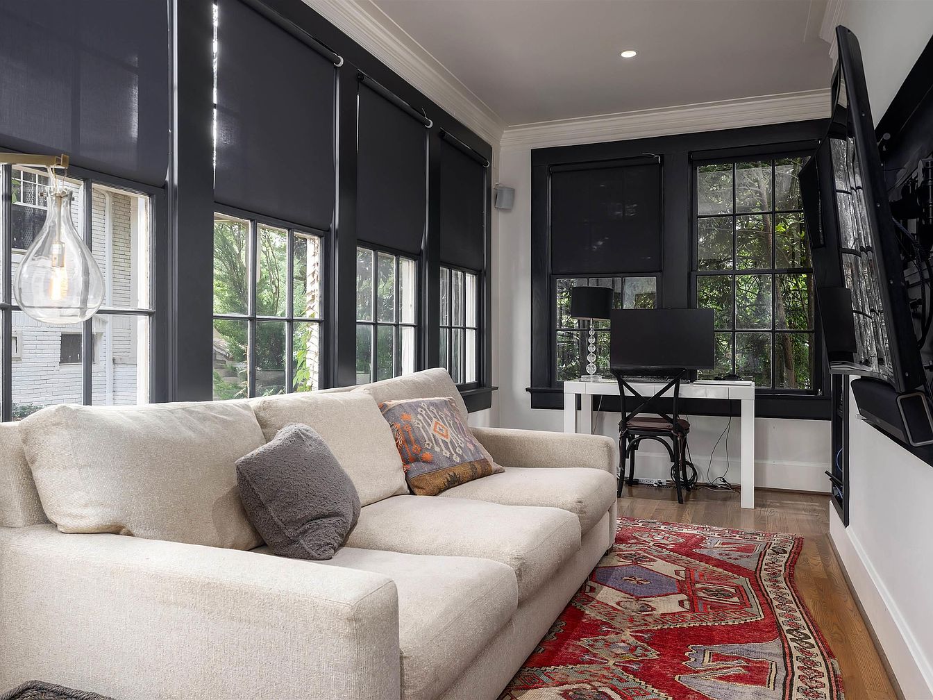 A cozy living room corner featuring a large, plush off-white sofa with soft gray and patterned pillows. Floor-to-ceiling black-trim windows line two walls, flooding the space with natural light while blackout shades provide privacy. The neutral wall color is complemented by elegant crown molding along the ceiling. A bold, patterned red area rug adds warmth and visual interest on the hardwood floor. In one corner, a simple white desk with a dark wood chair creates a small, elegant workspace, complete with a modern black lamp and computer monitor. A large, wall-mounted television faces the sofa, enhancing the room’s comfort and functionality.