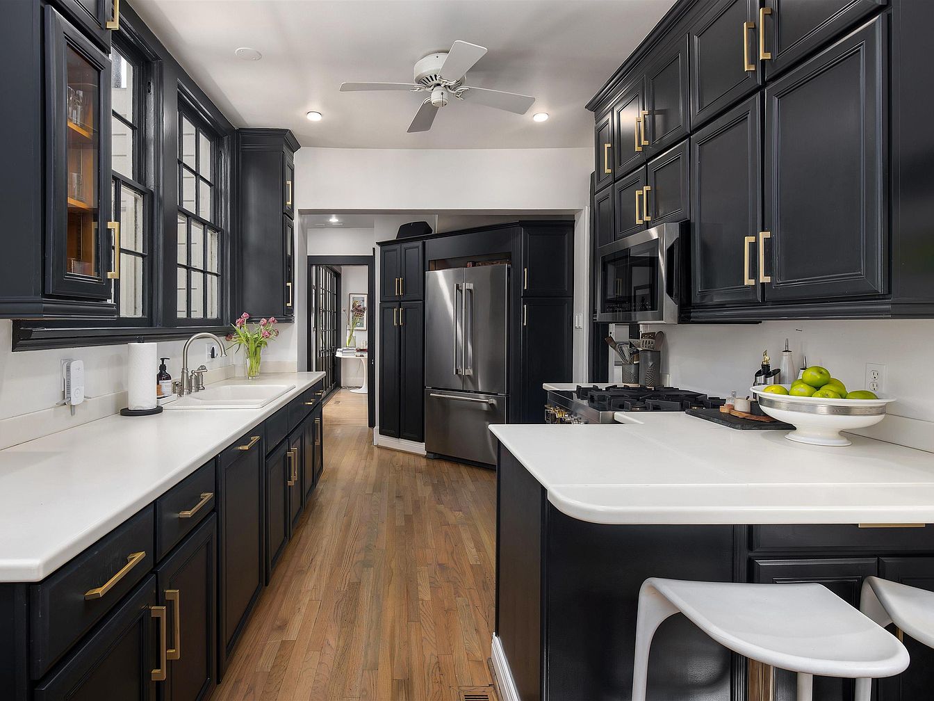 A galley-style kitchen with sleek black cabinetry adorned with gold handles provides a striking contrast to the white quartz countertops. The upper and lower cabinets offer ample storage, while tall windows let in abundant natural light above the long sink area. The stainless steel appliances, including a modern gas range and refrigerator, blend seamlessly into the space. A white ceiling fan and recessed lighting add brightness overhead. Light wood floors run the length of the kitchen, connecting the two ends. Minimalist bar stools sit by the breakfast counter, complemented by a bowl of green apples and fresh flowers for a touch of color.