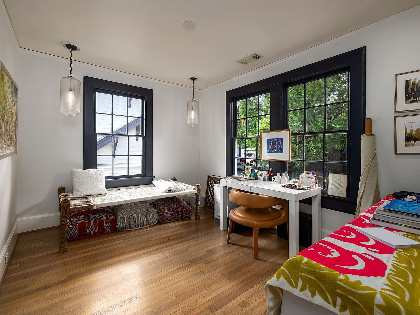 A cozy, light-filled home office space features hardwood floors and white walls with black-trimmed windows that let in ample natural light. Against the left wall sits a rustic wooden daybed with a woven seat, layered with neutral throw pillows and patterned cushions below. The far wall features a modern white desk paired with a tan, curved chair, positioned in front of two large windows overlooking leafy greenery. A bold textile in red, white, and yellow covers another work surface to the right, adding a splash of color. Minimalist pendant lights provide soft overhead illumination, and art pieces accent the tasteful, relaxed decor.