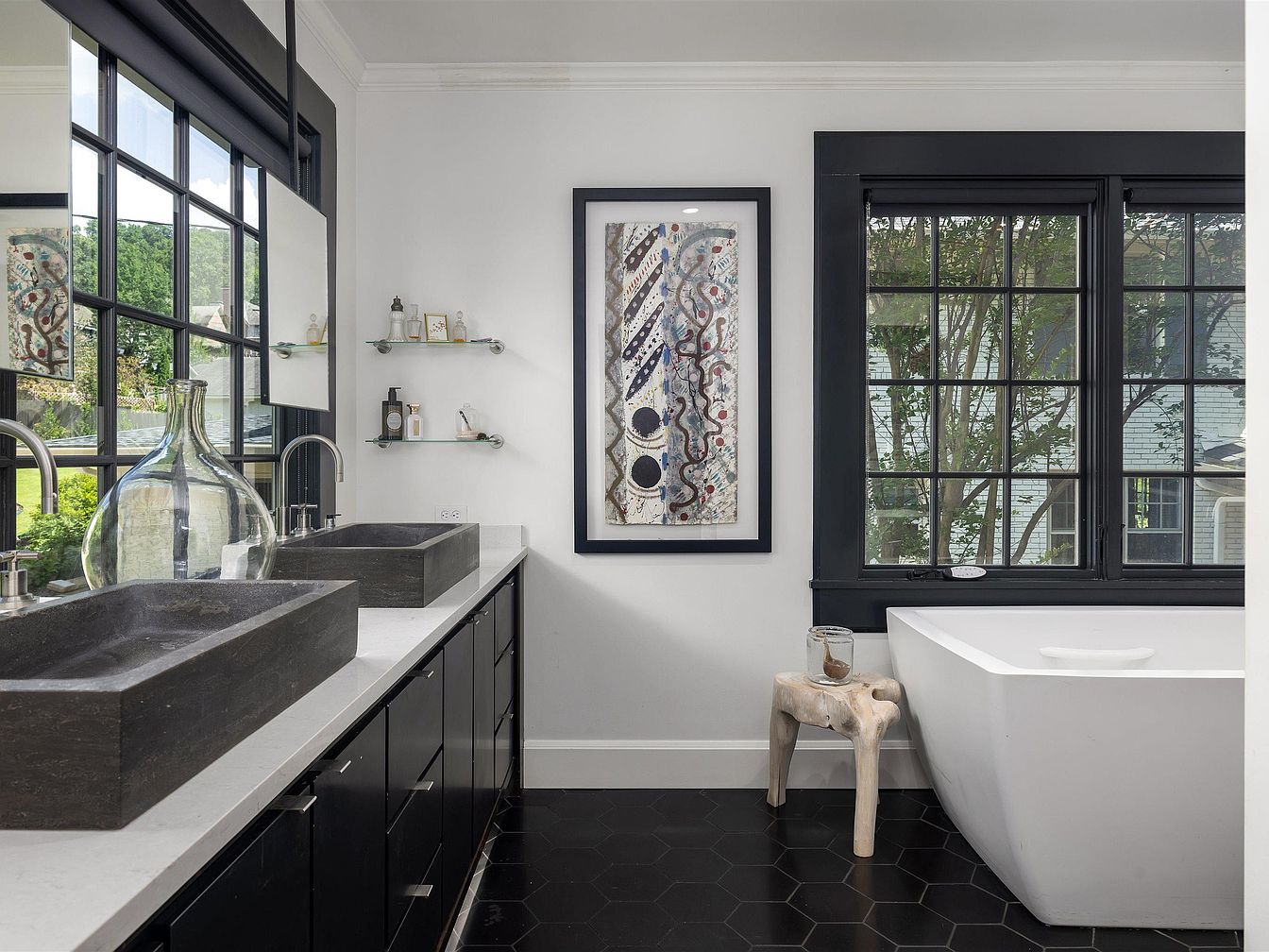 A modern bathroom with bold, contrasting elements and abundant natural light. Matte black hexagonal floor tiles anchor the space, paired with sleek black cabinetry and two large, rectangular black stone sinks with brushed metal faucets. The double vanity is topped with light quartz counters and a substantial glass vase. Above the vanity, generous mirrored panels reflect the outdoors, while black-framed windows along one wall frame a freestanding white soaking tub. An organic wooden stool with a glass accent sits beside the tub. Shelves hold minimalist toiletries, and a large abstract art piece adds visual interest to the crisp white walls.