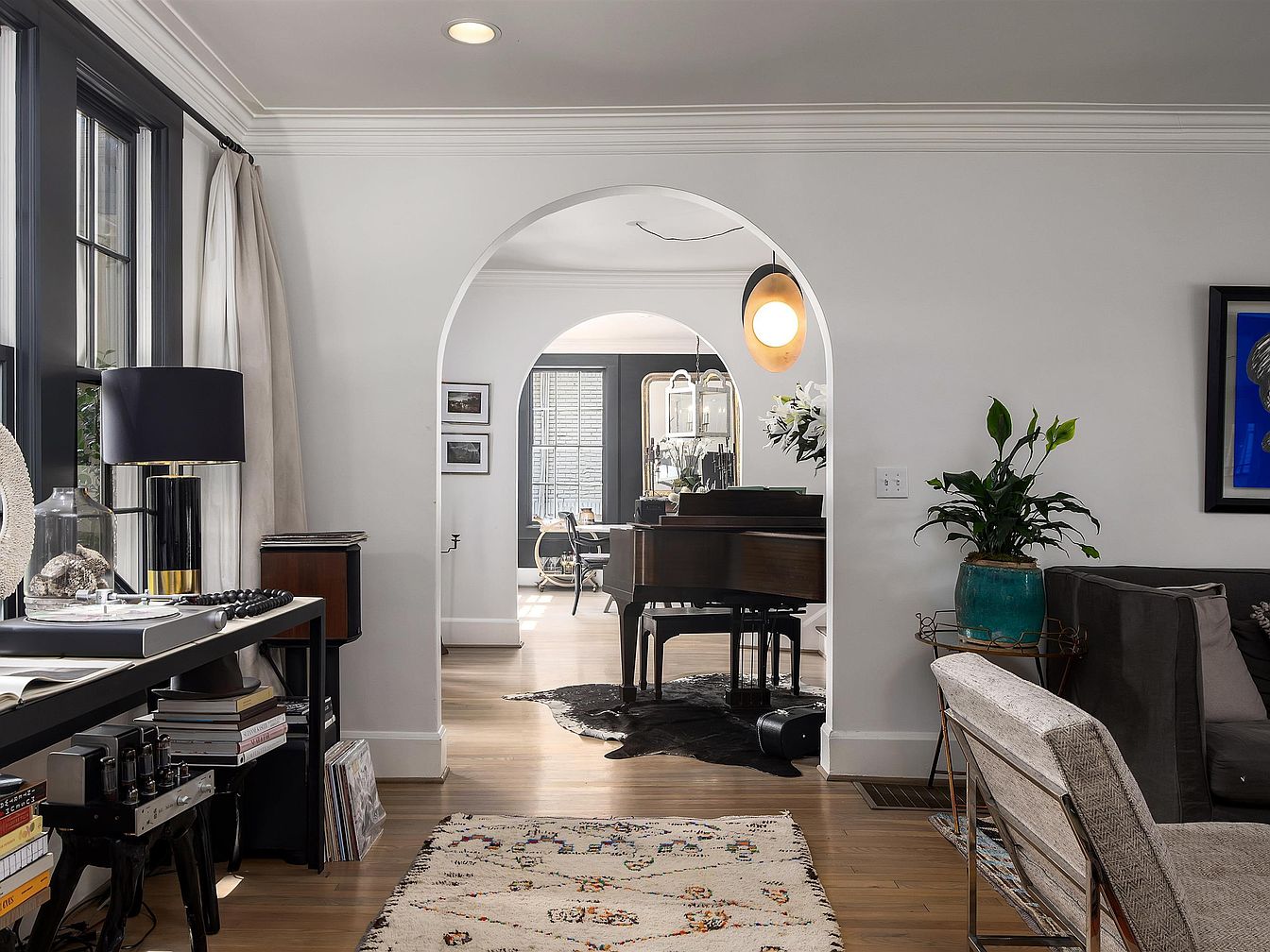 A bright living space with crisp white walls features a graceful, rounded archway leading into a connected dining or music room where a grand piano is the focal point. Natural light streams through large, black-trimmed windows with white draping curtains, accentuating the airy atmosphere. The decor combines modern and vintage elements with a sleek black console table topped by artful accents and books, complemented by a plush light rug displaying a subtle geometric pattern. Soft gray sofas, lush potted plants, and framed artwork on the walls produce a balanced, inviting blend of classic architecture and contemporary aesthetics.