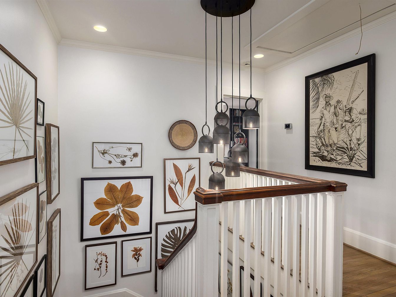 A bright stairwell landing features crisp white walls and a railing with classic white spindles and rich wood handrails. The gallery wall is thoughtfully arranged with naturalistic botanical prints—leaves, ferns, and flowers in warm earth tones. A woven basket and an expressive monochrome sketch add visual interest. Overhead, a cluster of black pendant lights with exposed bulbs hangs at varying heights, casting soft illumination. The overall aesthetic blends natural elements with contemporary lighting, highlighting an airy and inviting transitional space. Pale wood floors complete the look with warmth and understated texture.
