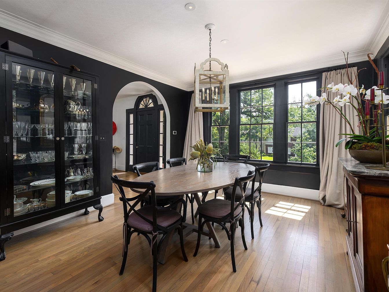 A spacious, elegantly styled dining room with large black-trimmed windows letting in abundant natural light, framing a lush green view outside. The room features soft wood floors and a black-painted wall accented by white crown molding. Centered in the space is an oval wooden dining table surrounded by black cross-back chairs. On the left, a tall glass-front china cabinet displays gleaming crystal and silverware. To the right, a wooden sideboard holds a white orchid in bloom and red candles, adding sophistication. An iron lantern pendant light hangs overhead, complementing the classic yet contemporary aesthetic of the room.