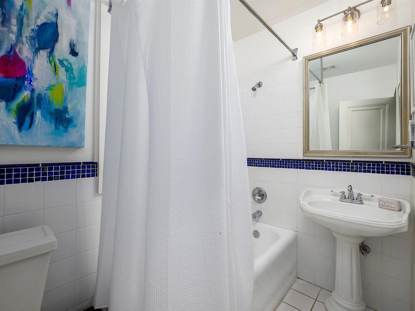 A compact bathroom featuring a white pedestal sink with chrome fixtures and a rectangular mirror in a brushed metal frame above it. Beside the sink is a simple white toilet. The bathtub is partially hidden by a white textured shower curtain and is surrounded by white ceramic tile. A horizontal row of small, dark blue accent tiles adds color and contrast to the white walls. Above the mirror, a clear three-bulb vanity light fixture provides illumination. On the left wall hangs an abstract painting in vibrant blue, green, magenta, and yellow, adding artistic flair to the clean, bright space.