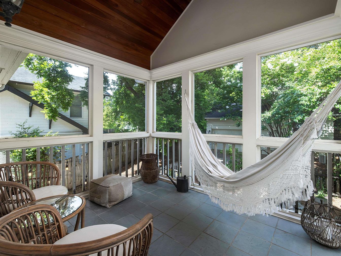 A cozy screened porch features open views onto leafy trees, framed by large white-trimmed windows. Natural light filters in, highlighting a classic white fringed hammock suspended across one side, adding a relaxed, bohemian touch. Rattan furniture with plush white cushions sits around a glass-topped coffee table near the corner, providing an inviting seating area. The floor is covered with grayish-blue tiles that complement the neutral tones throughout the space. A wooden-paneled ceiling brings warmth and contrast, while woven ottomans and accent baskets complete the laid-back, serene ambiance, making this a perfect spot for lounging.