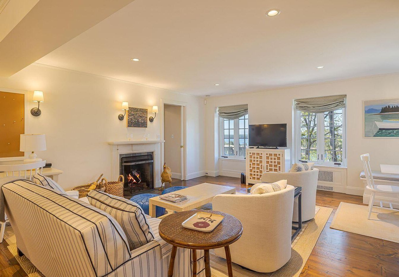 This inviting living room features a cozy arrangement with a white sofa adorned with blue stripes and a pair of elegant armchairs. A light wooden coffee table sits at the center, complemented by a round side table made of woven materials. Soft lighting from mounted sconces and table lamps enhances the warm ambiance. A traditional fireplace adds charm, with a simple mantel displaying a decorative piece. Large windows with tailored curtains offer picturesque views, while the warm wooden flooring and neutral color scheme contribute to a serene atmosphere, perfect for relaxation and social gatherings.