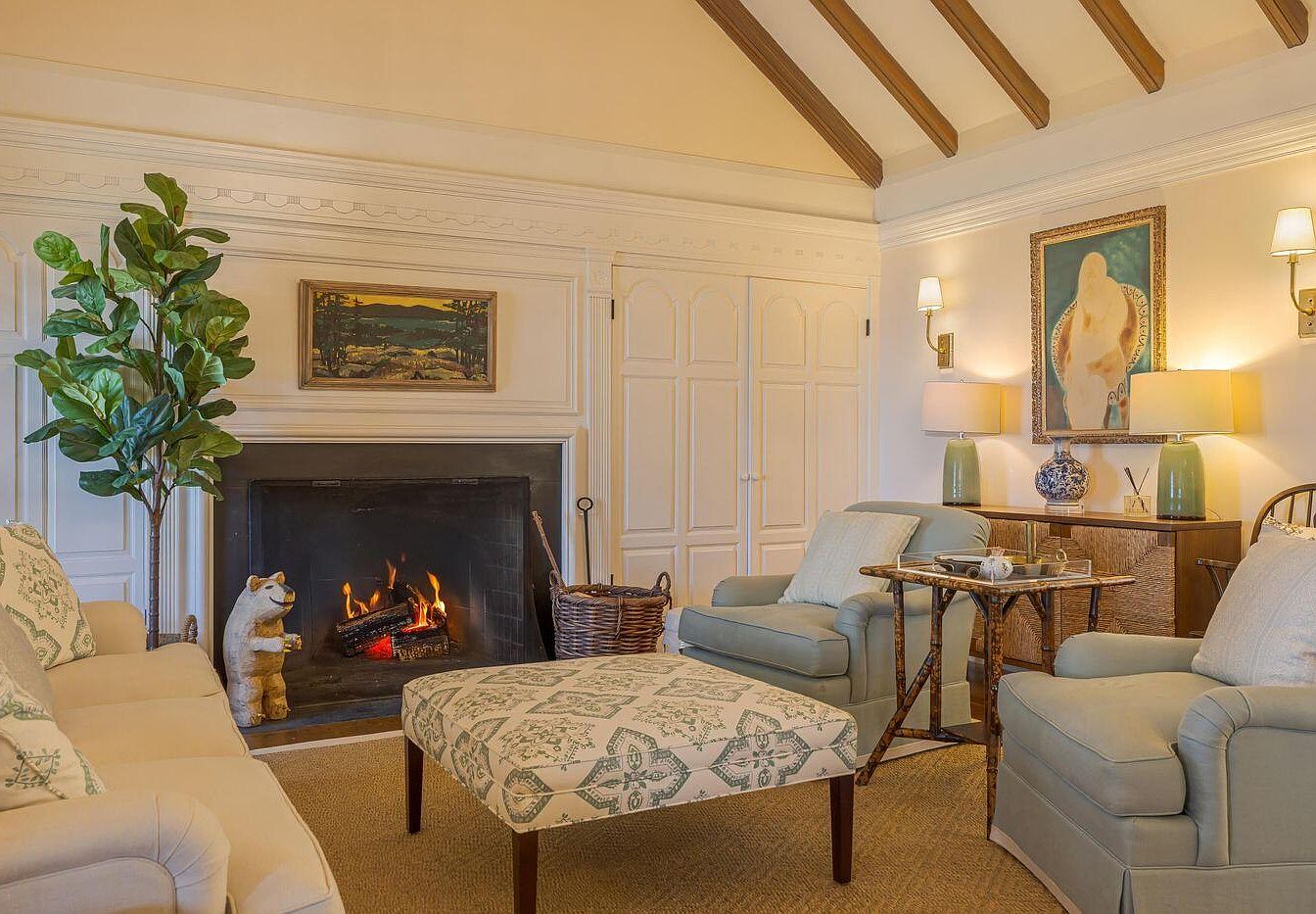 This cozy living room features a warm fireplace as its centerpiece, with flickering flames illuminating the room. The ceiling is adorned with exposed wooden beams, creating a rustic charm. Soft color tones of beige and light blue dominate the space, complemented by a patterned ottoman that serves as both seating and decor. Two comfortable armchairs in light blue invite relaxation, while a pale sofa with cushions adds to the inviting atmosphere. A tastefully framed landscape hangs above the fireplace, and decorative lamps on side tables provide additional warmth. Lush greenery enhances the natural aesthetic, completing the tranquil vibe.