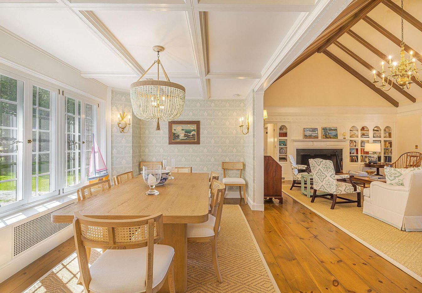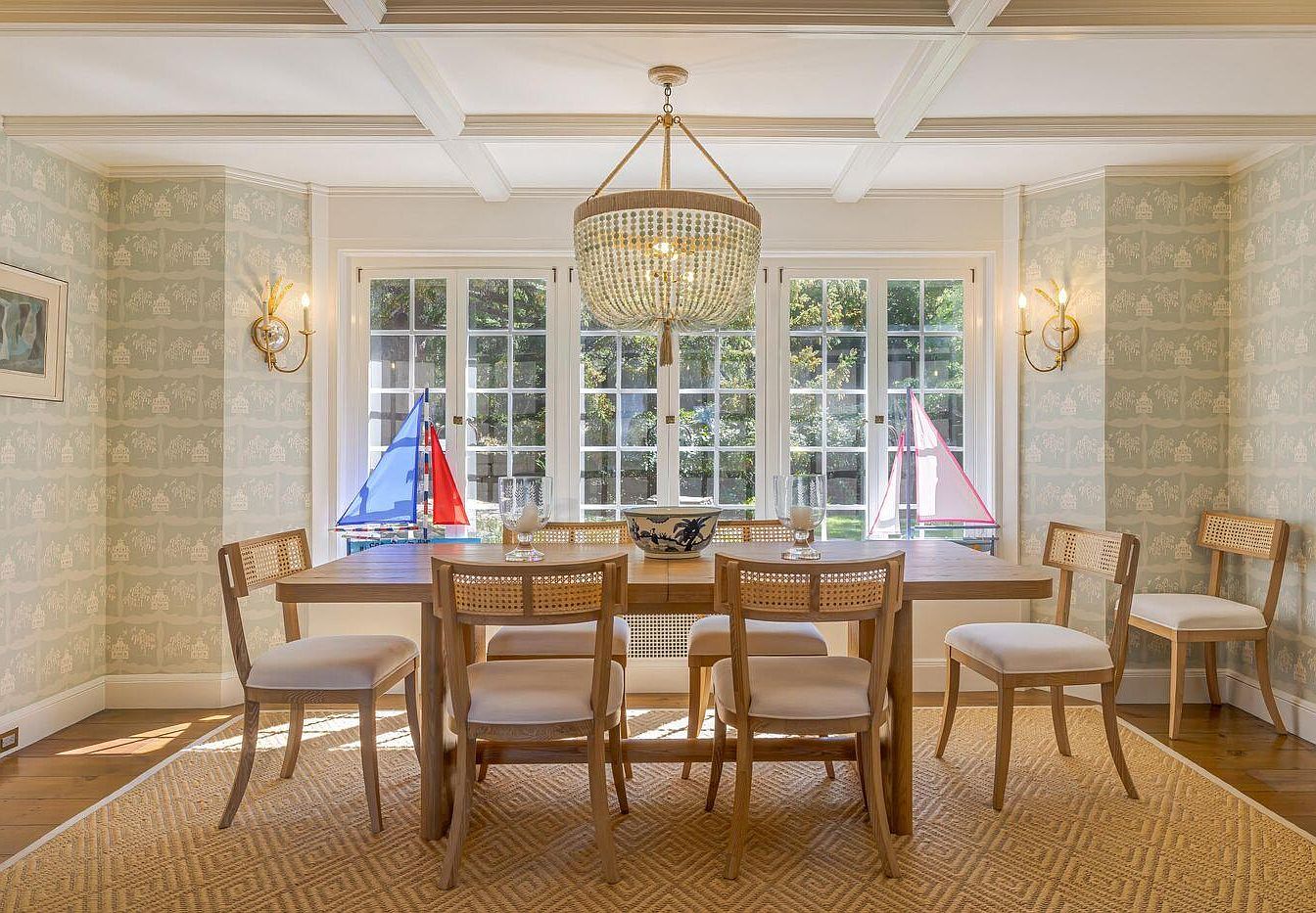 A cozy dining room featuring a light wood table surrounded by six elegantly designed chairs with caned backs, creating a harmonious blend of comfort and style. The walls are adorned with soft, pastel wallpaper that adds a subtle backdrop to the space. A large, eye-catching chandelier hangs from the coffered ceiling, its shimmering crystals reflecting light beautifully. Natural light floods the room through expansive windows, highlighting a patterned area rug beneath the table. Sailboat decorations in vibrant red and blue add a playful touch, enhancing the airy ambiance and inviting casual gatherings.