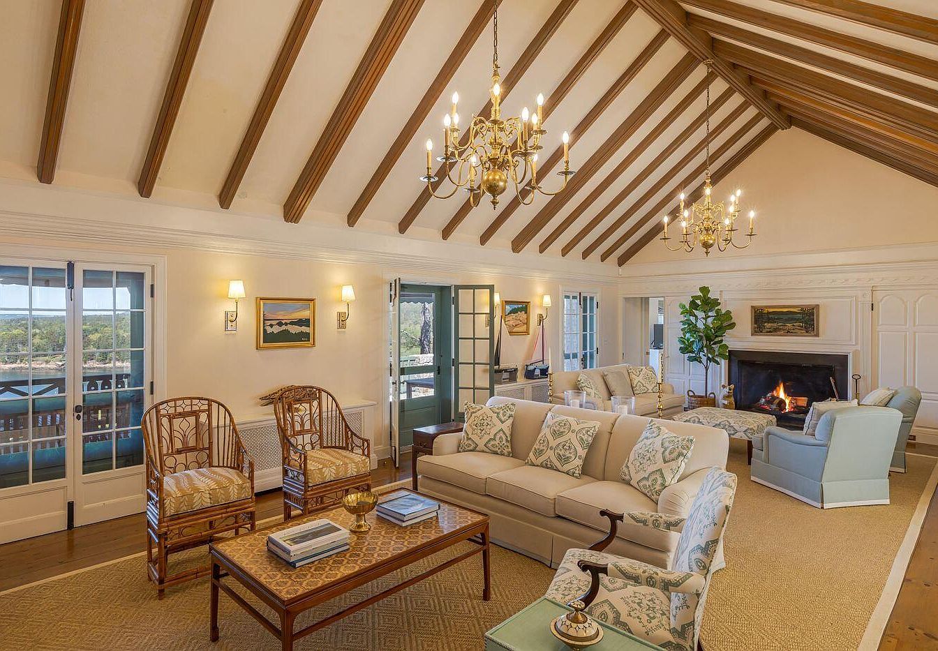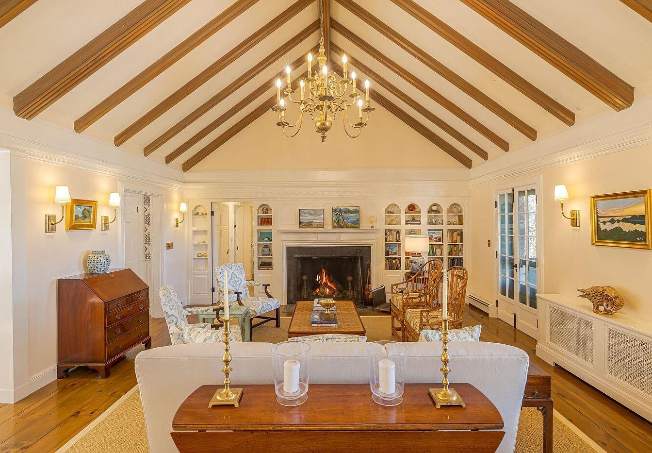 The spacious living room features a high, vaulted ceiling with exposed wooden beams, creating an airy feel. Light, neutral wall tones complement the warm wood accents. Classic furniture includes an elegant sofa facing a cozy fireplace, with decorative candles atop a wooden console. Two armchairs with soft blue floral patterns are paired with a rustic coffee table, inviting relaxation. Built-in bookshelves showcase a variety of books and art pieces, enhancing the room’s charm. Elegant wall sconces provide soft illumination, while large windows offer views of the outdoors, ensuring natural light floods the space.