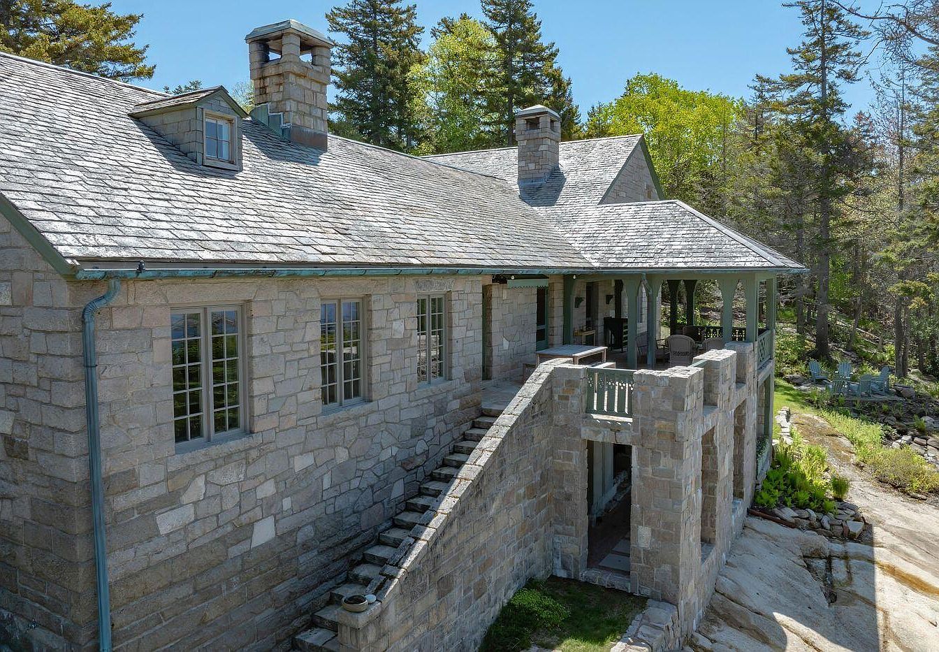 This image presents a charming exterior of a historic home featuring natural stone construction and a slate roof. The earthy tones of the stone contrast gracefully with the light green trim around the windows and railings. The structure showcases a balanced design with prominent chimneys and a slightly sloped roof, while the staircase leading to the upper level adds depth. Surrounding the house, lush trees provide a serene backdrop, enhancing the outdoor appeal. An inviting porch area hints at comfortable outdoor seating and captures the essence of a tranquil retreat.