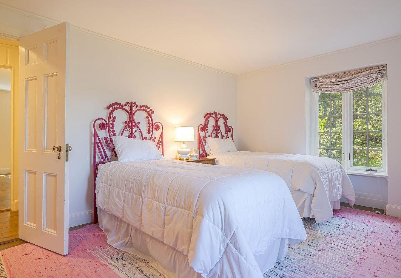A cozy guest bedroom features two neatly made twin beds adorned with white comforters. The standout element is the vibrant pink, intricately designed headboards that add a playful touch to the space. On the bedside table sits a soft-glowing lamp, creating a warm atmosphere. The flooring is covered by a light pink rug that harmonizes with the headboards while offering a comfortable feel underfoot. Bright natural light streams in through the window, highlighting the soft cream walls and enhancing the serene ambiance. A door on the left leads to another area, contributing to the room’s spacious layout.