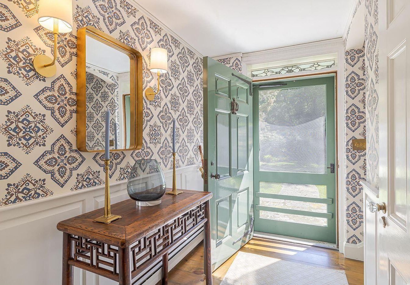 This entryway features an inviting layout, combining rustic charm and modern aesthetics. A vintage wooden console table stands against a patterned wallpaper, with intricate blue and beige motifs creating visual interest. The mirror above the table adds brightness and depth, framed in sleek gold. Two sconces provide warm lighting, enhancing the welcoming atmosphere. A large glass vase sits on the table, complemented by elegant candlesticks. The rich wooden floor contrasts with the light wallpaper, while the vibrant green door leads outside, suggesting a seamless connection with nature. Overall, this space exemplifies a blend of elegance and comfort.