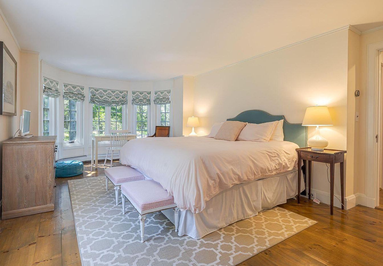 A spacious bedroom featuring soft pastel tones, predominantly beige with white accents. The large bed, adorned with fluffy pillows, is the focal point, flanked by elegant nightstands with lamps. Natural light floods the room through a curved bay of windows, framed with patterned valances. A plush area rug with a geometric design adds warmth to the hardwood floors. Two charming upholstered benches sit at the foot of the bed, inviting comfort. A small, round teal ottoman provides a pop of color, while a simple wooden dresser and a small writing desk complete the layout, enhancing the room’s cozy atmosphere.