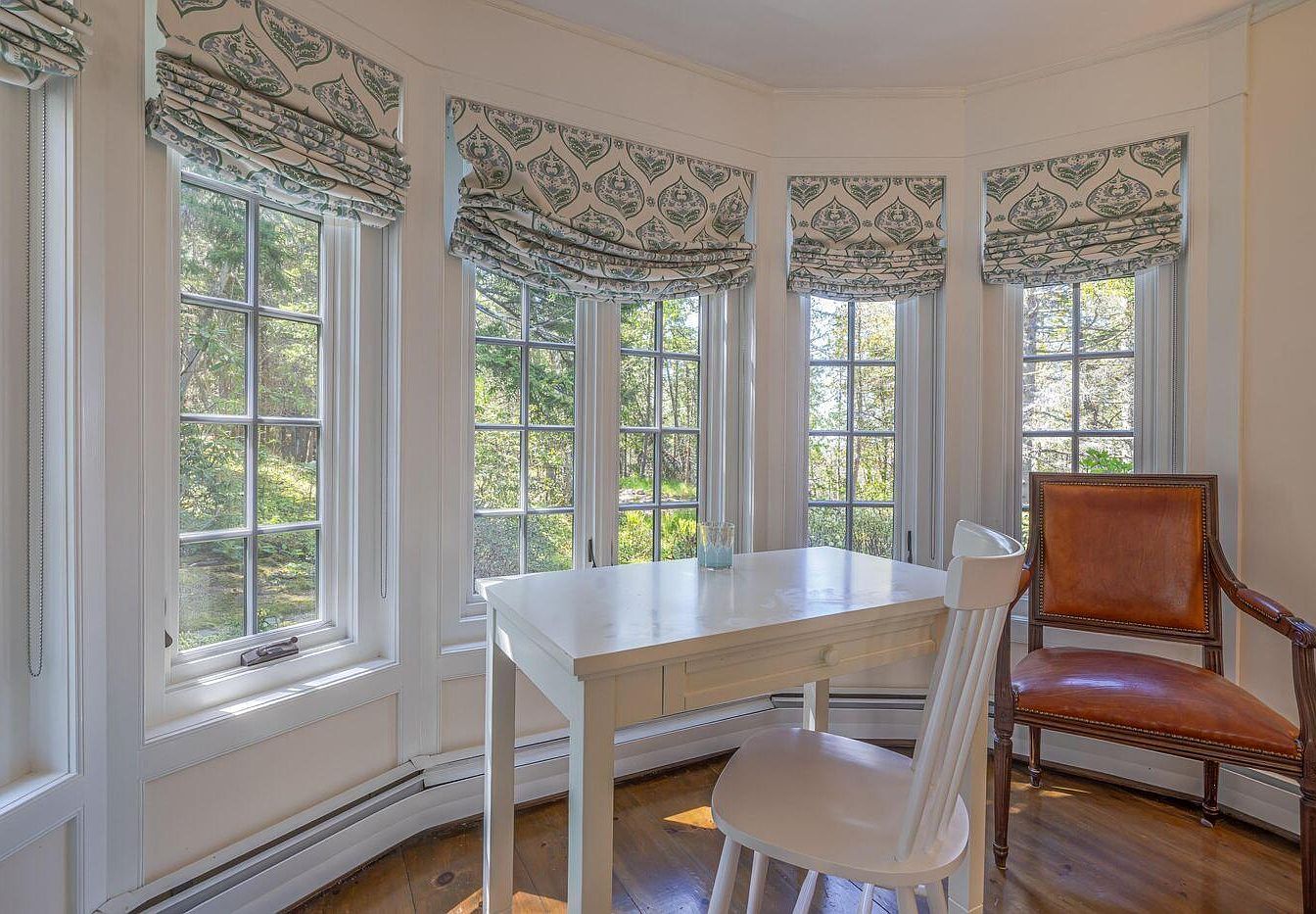 This sunroom corner features charming bay windows, framed by decorative fabric shades in a subtle pattern. A white table sits at the center, complemented by a vintage-style wooden chair with brown upholstery. The large windowpanes offer expansive views of the greenery outside, inviting natural light to illuminate the space. The warm wooden floor contrasts beautifully with the light color tones of the walls, enhancing the overall cozy and welcoming atmosphere. Architectural details, such as the woodwork around the windows, highlight the historic character of the home, making it an ideal spot for relaxation or casual dining.