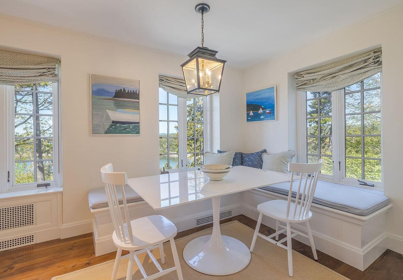 This cozy breakfast nook features a circular white table surrounded by three modern white chairs. Large windows frame the area, providing ample natural light and views of the outdoors. The walls are painted a soft cream, complemented by light, airy fabrics on the window treatments. A pendant light hangs from the ceiling, casting a warm glow. Decorative artwork of serene water scenes adorns the walls, enhancing the tranquil atmosphere. A cushioned bench with blue and white throw pillows offers comfort and adds a pop of color, creating an inviting space for morning meals or afternoon relaxation.