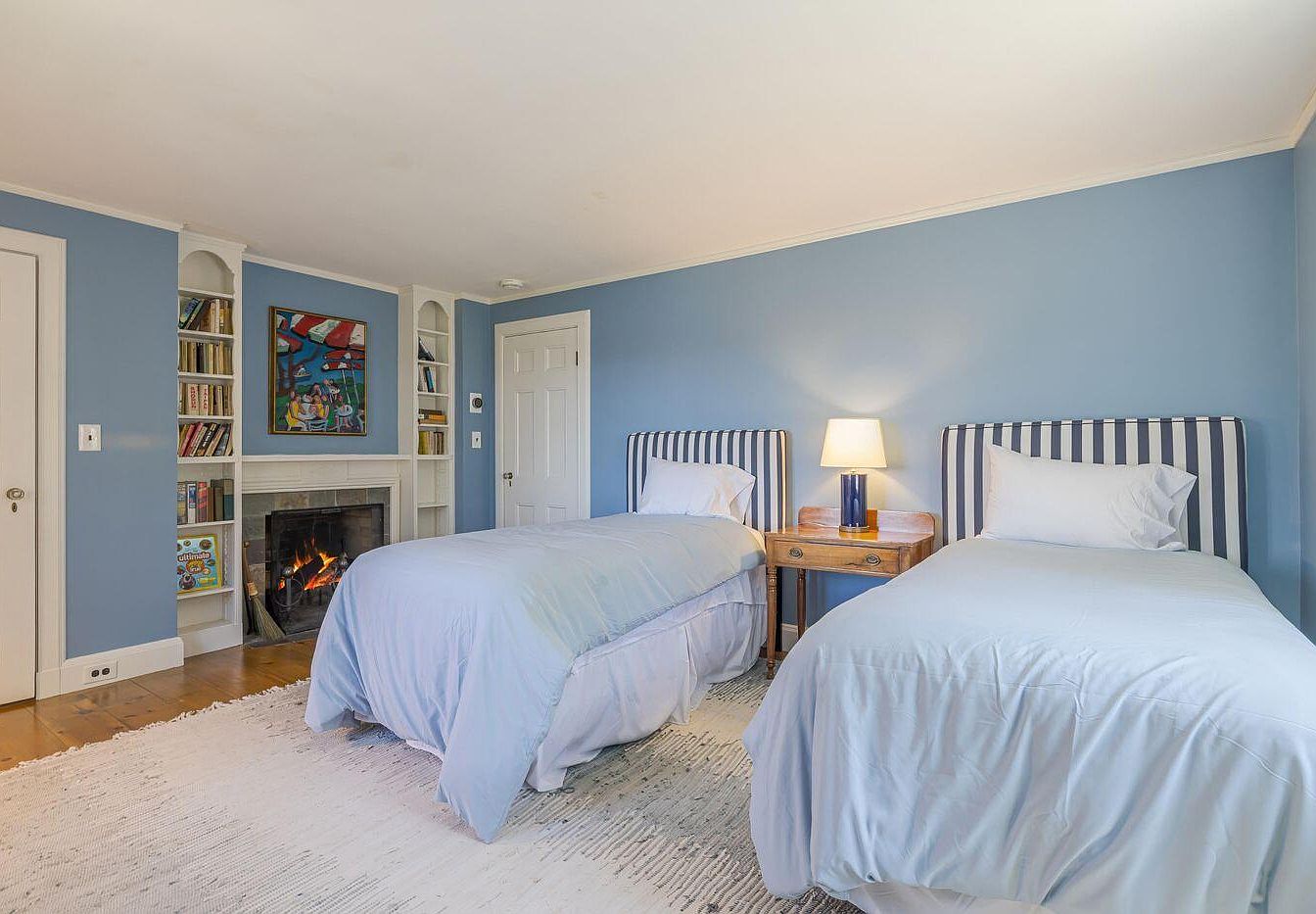 The guest bedroom features two twin beds, each adorned with soft blue bedding and striped upholstered headboards. A cozy rug adds warmth to the hardwood floor, while a small wooden nightstand holds a lamp, providing a soft glow. The walls are painted a light blue, complemented by built-in shelves filled with books and decor, adding character and functionality. A framed artwork hangs above the fireplace, introducing bright colors and artistic flair. A closet and white panel doors blend seamlessly into the room’s design, ensuring a cohesive and inviting atmosphere for guests.