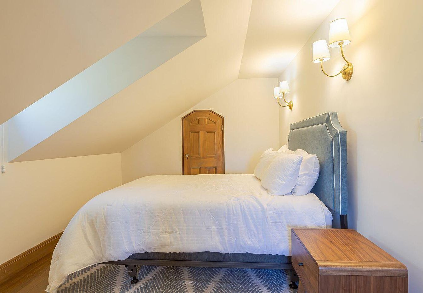 This cozy bedroom features a slanted ceiling, enhancing its charming attic feel. The walls are painted in a soft, warm white, complementing the natural wooden tones of the floor and door. A plush bed, dressed in crisp white linens, is presented with a blue upholstered headboard, providing a pop of color. Flanking the bed, stylish wall sconces cast a gentle glow, adding to the inviting ambiance. A sleek side table with a natural wood finish sits beside the bed, offering practicality and warmth. The room’s layout, highlighted by an angled wall and door, creates an intimate yet spacious atmosphere.