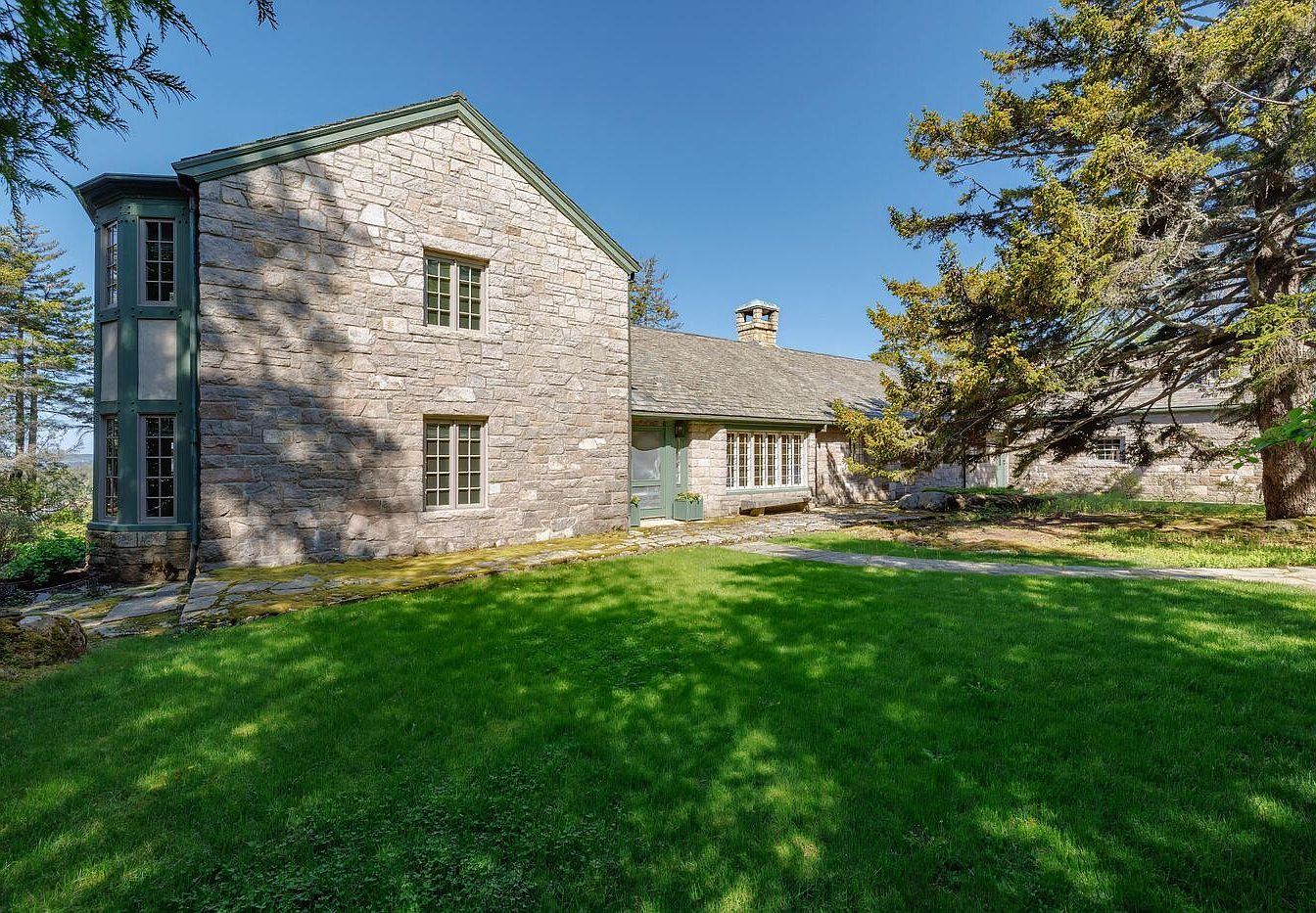 The image showcases a historic American home featuring a solid stone facade, blending rustic charm with sturdy design. Its dual-story structure is marked by a steeply pitched roof, highlighted against a clear blue sky. Large, vertically-oriented windows with green accents compliment the stone, allowing natural light to flood the interiors. A well-manicured lawn stretches across the foreground, bordered by mature trees offering shade and privacy. The expertly laid stone pathway enhances the home’s welcoming appeal, while the traditional chimney adds a classic touch to the overall aesthetic, harmonizing with the surrounding natural landscape.