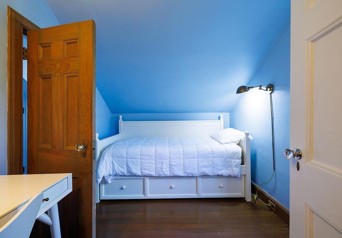 A cozy attic bedroom featuring slanted blue walls and a wood door leading to the hallway. The room centers around a white trundle bed adorned with a plush white comforter and pillows, creating an inviting atmosphere. A minimalist white desk with sleek lines enhances functionality without crowding the space. Natural wood flooring adds warmth, contrasting nicely with the bright blue and white color scheme. A modern black floor lamp provides targeted lighting, accentuating the room’s simplicity. The overall design emphasizes a tranquil retreat, blending contemporary elements with the home’s historical charm.