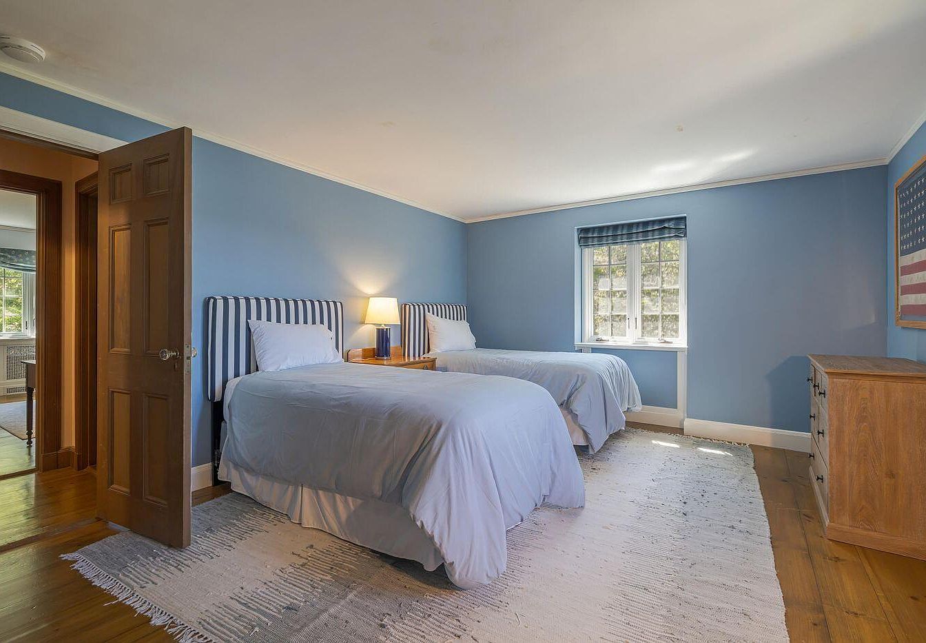 This guest bedroom features two twin beds with striped headboards and light blue bedding, creating a serene atmosphere. The walls are painted in a soft blue, complementing the warm wooden flooring. A small nightstand with a lamp is placed between the beds, adding functionality and warmth. Natural light flows in through a window adorned with a plaid curtain, and a chic area rug lies underneath, enhancing comfort. A wooden dresser against the wall offers additional storage, while a framed patriotic artwork adds a touch of history and character to the space, making it inviting and cozy.