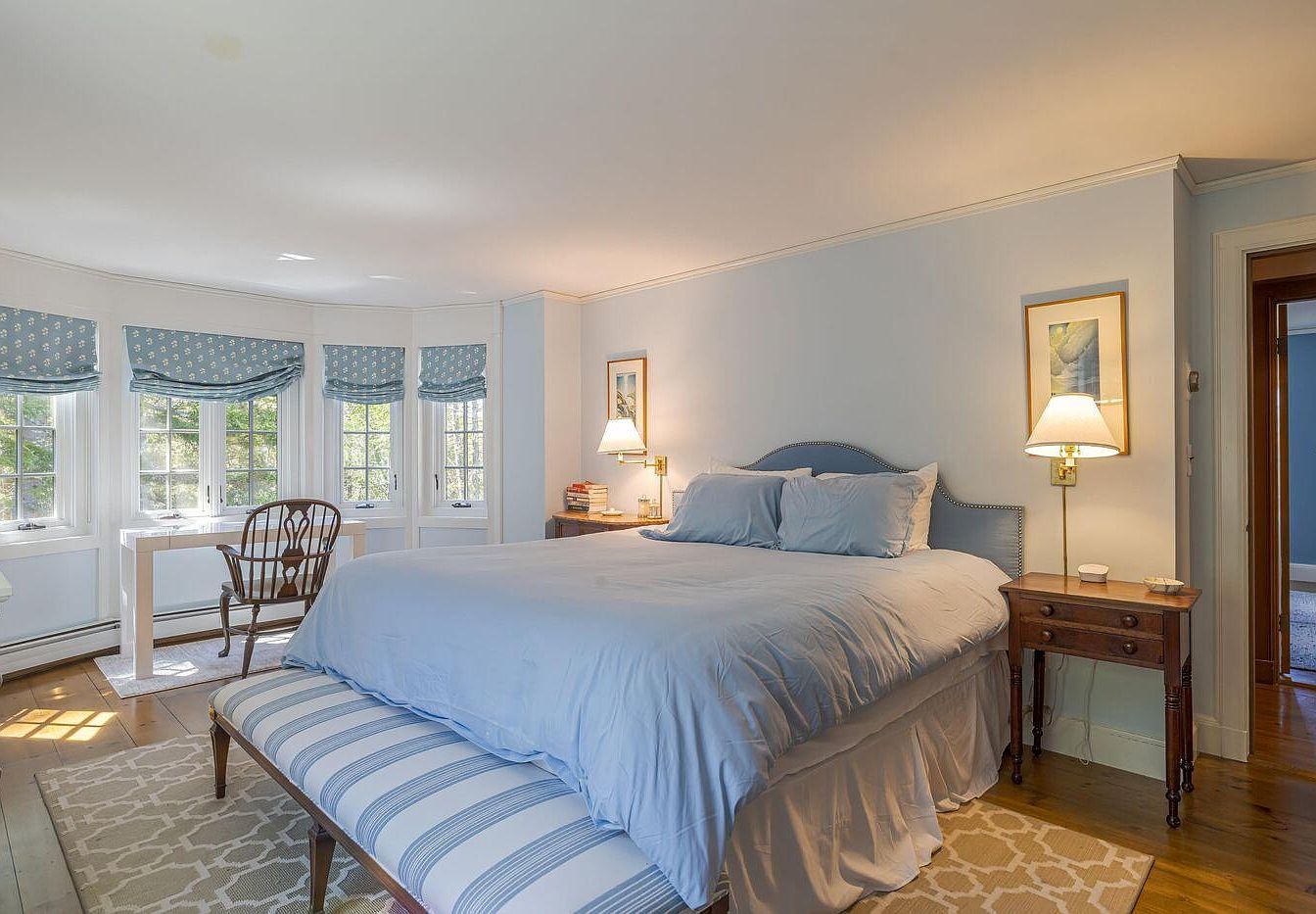 A serene bedroom featuring soft blue walls that create a calming atmosphere. The main focus is a plush, cushioned bed with light blue bedding, complemented by a striped upholstered bench at its foot. Natural light floods in through a series of classic windows with blue and white patterned valances, offering a glimpse of the lush outdoors. A small wooden table beside the bed holds a stylish lamp with a warm glow. A vintage wooden chair adds character to the space, while the warm wood flooring and patterned area rug enhance the cozy feel of this inviting retreat.