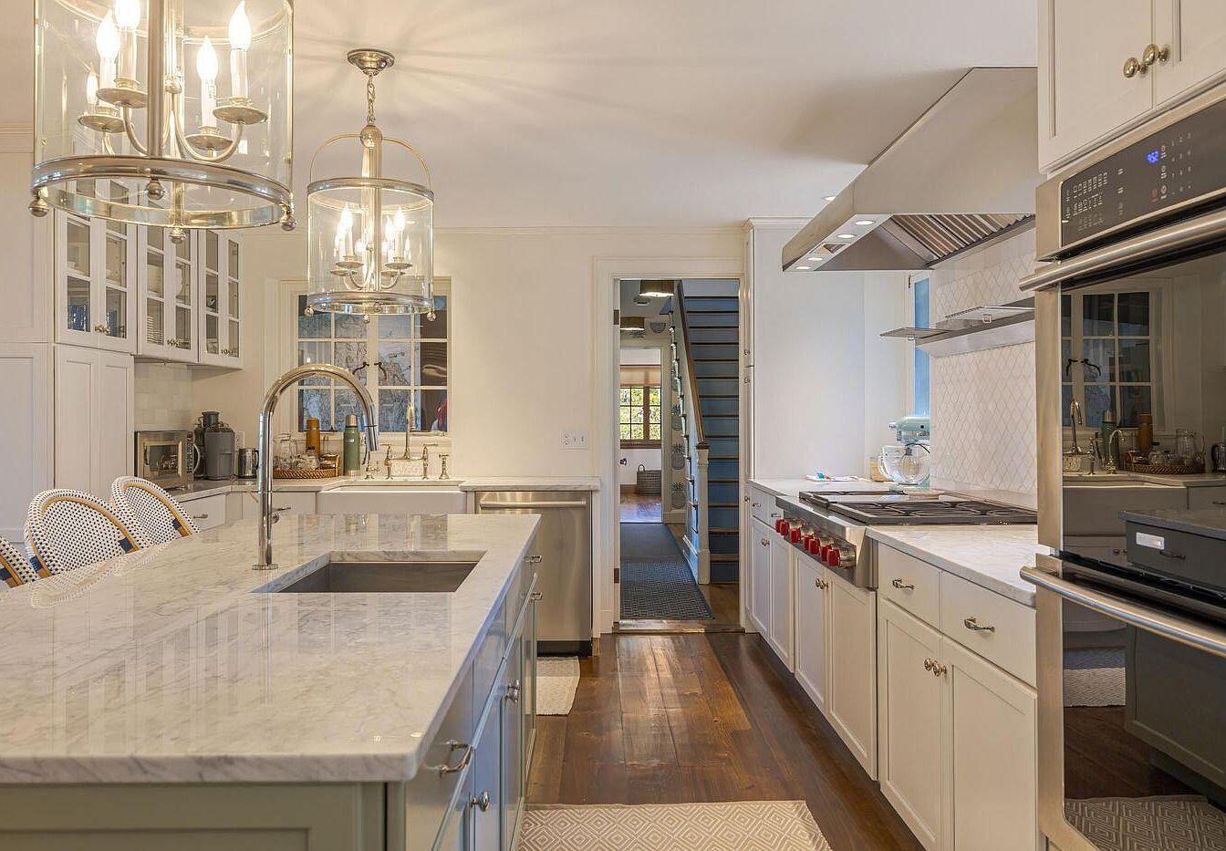 This modern kitchen showcases a spacious layout with a central island featuring a polished white marble countertop, complemented by soft green cabinetry. Overhead, elegant light fixtures hang, providing warm illumination. Stainless steel appliances, including a gas range with red knobs, contrast beautifully with the cabinetry. A farmhouse-style sink is strategically positioned beneath a window, allowing natural light to flood the space. The flooring consists of rich hardwood, enhancing the warm tones of the decor. To the side, crisp white cabinetry encases glass-fronted storage, blending functionality with aesthetics, while a glimpse of stairs leads to additional areas of the home.