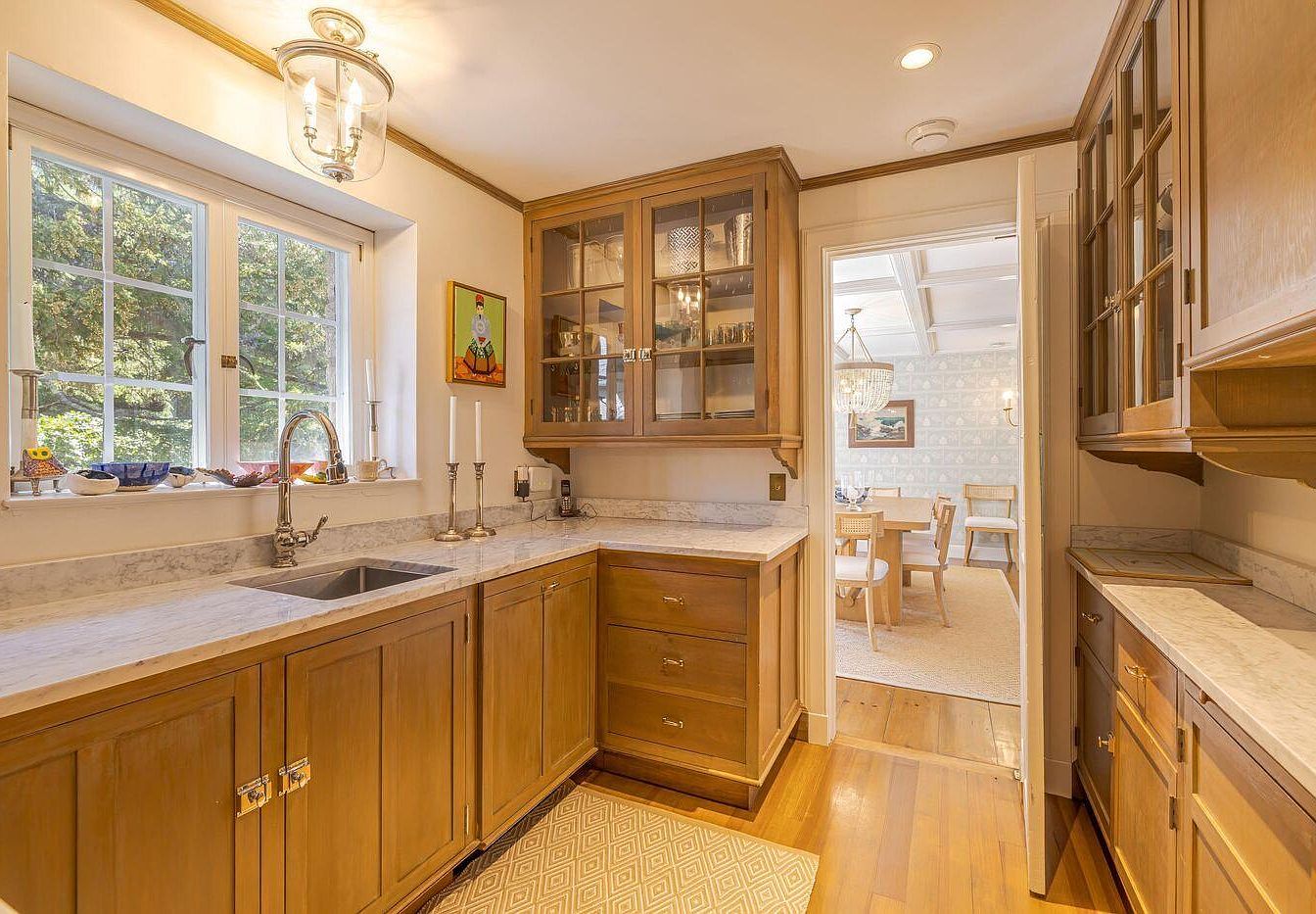This kitchen features a warm, inviting layout with natural wood cabinetry and marble countertops. A window above the sink allows ample natural light, enhancing the space’s brightness. The cabinets, a rich honey tone, are fitted with sleek metal hardware, while glass upper cabinets showcase decorative items. A classic overhead light fixture adds elegance, balanced by two candlesticks placed on the countertop. The floor is adorned with light hardwood, leading toward a dining area visible through an arched doorway. The soft color palette is complemented with cheerful artwork, creating a cozy yet functional kitchen atmosphere.