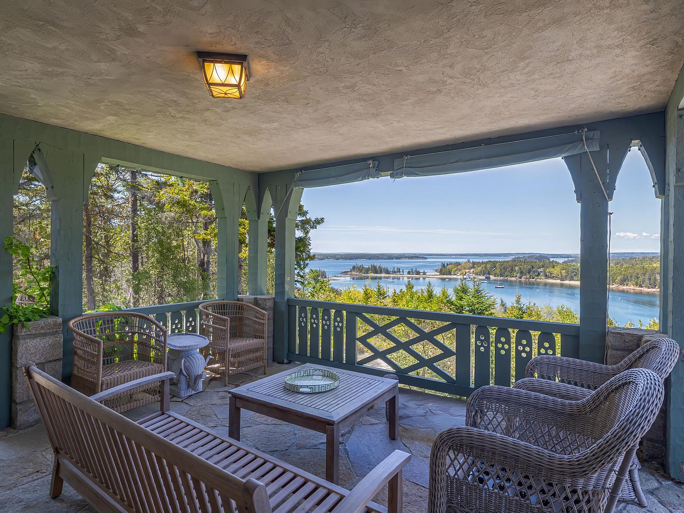 This outdoor terrace offers panoramic views of the water and surrounding landscape. The space features a stone floor complemented by a rustic wooden table, ideal for dining al fresco. Surrounding the table are wicker chairs, adding a cozy touch to the setting. The architectural details include green wooden railings with decorative cutouts, harmonizing with the natural surroundings. Awnings provide shade while enhancing the architectural style, framed by charming archways that integrate seamlessly with the outdoors. Vibrant greenery and the distant shoreline serve as a picturesque backdrop, creating an inviting atmosphere for relaxation and enjoyment.