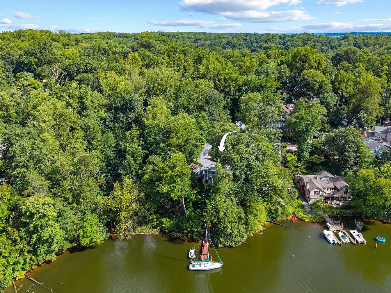 This aerial view showcases a lush, green landscape surrounding a serene body of water. Numerous trees create a vibrant canopy, contributing to the tranquility of the environment. The house, partially obscured by foliage, suggests a cozy, secluded retreat. Adjacent to the water, several boats are docked, hinting at recreational opportunities. The gentle waves on the lake and the reflection of the surrounding greenery create a harmonious interplay of nature and architecture. Nearby, homes exhibit varied designs, blending traditional styles with modern elements, preserving the area’s historic charm while ensuring a picturesque residential community.